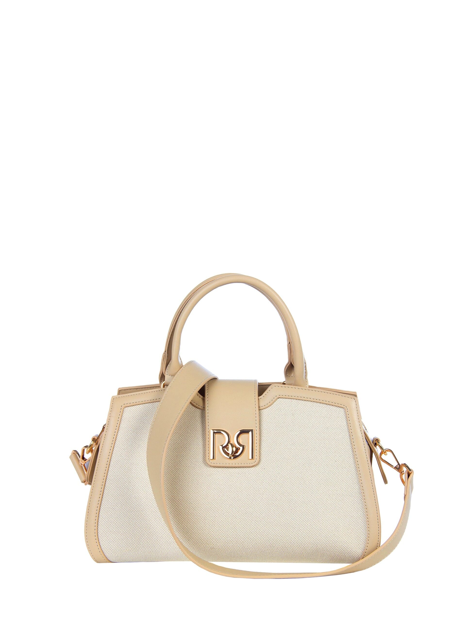 A structured medium-volume accessory in compact canvas with soft leatherette trim. The metallic logo on the front and the removable adjustable shoulder strap make it practical and sophisticated, ideal for the office and to accompany you in style around town.