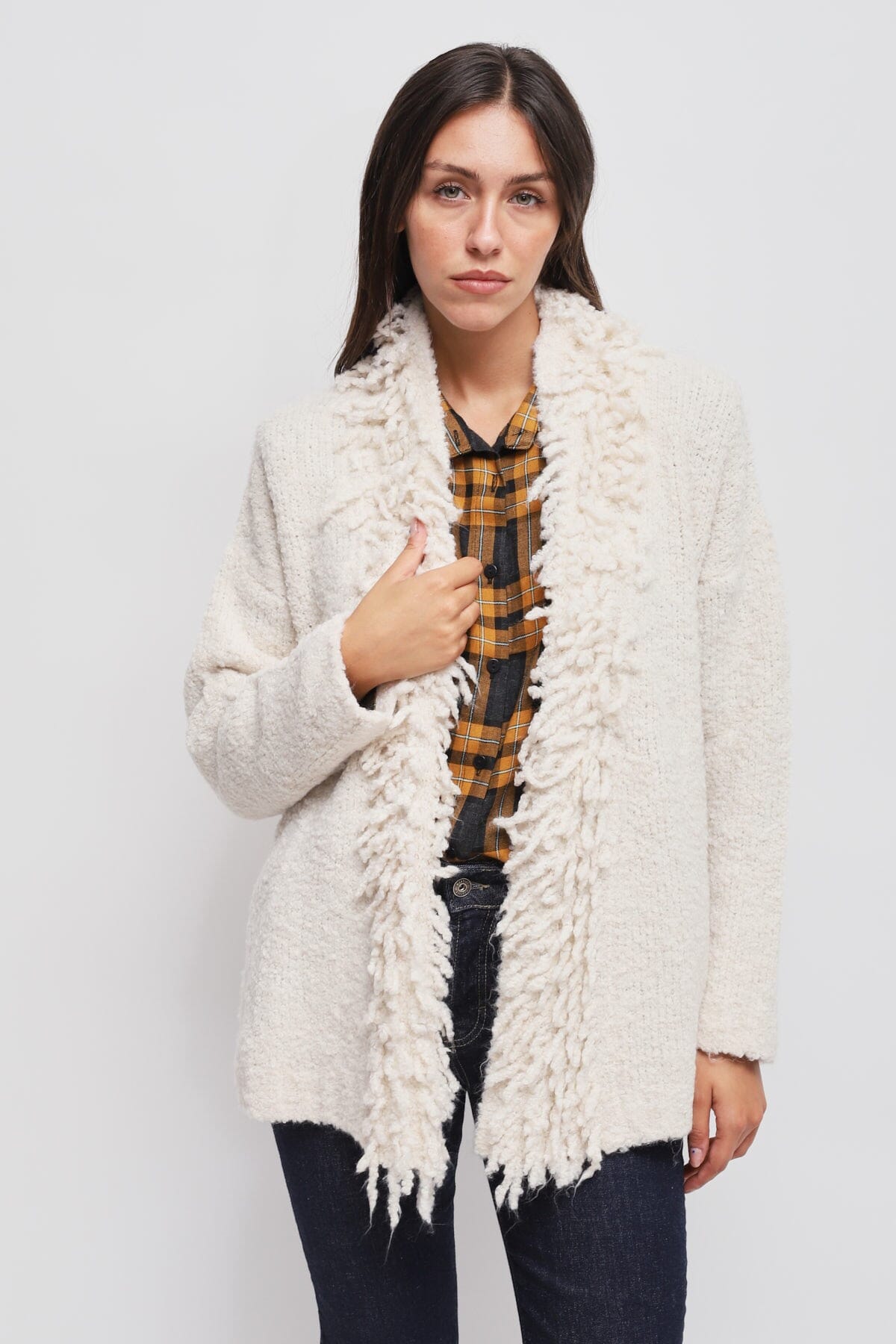 Maryley interprets a relaxed-fit layer in soft bouclé knit. The front edge is finished with voluminous fringes that frame the bust, with a shawl profile without fastenings for a natural fall. Warm and light, it goes well with denim or dresses: perfect for the casual office and leisure time.
