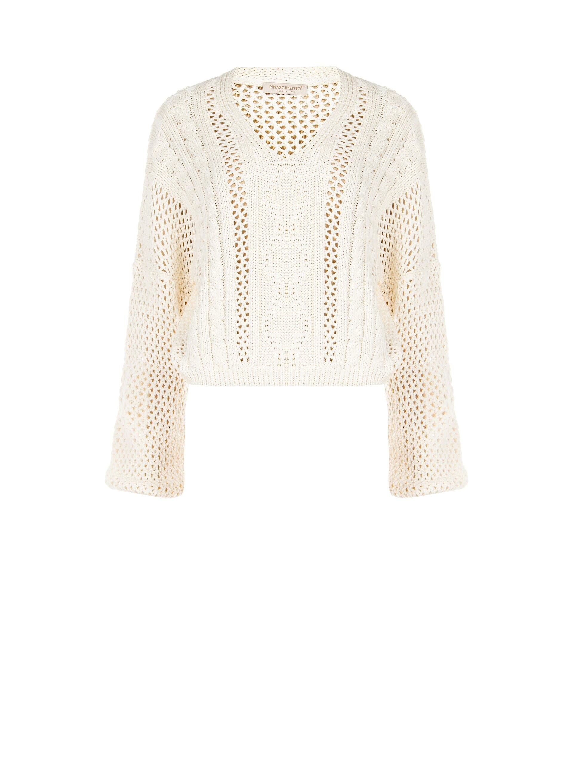 Cotton-blend pullover with a soft and slightly short fit, designed to naturally accompany the silhouette. The perforated workmanship with braids and lozenge motif, together with the V-neckline, lends breath and femininity. Perfect for everyday chic, office and weekends.