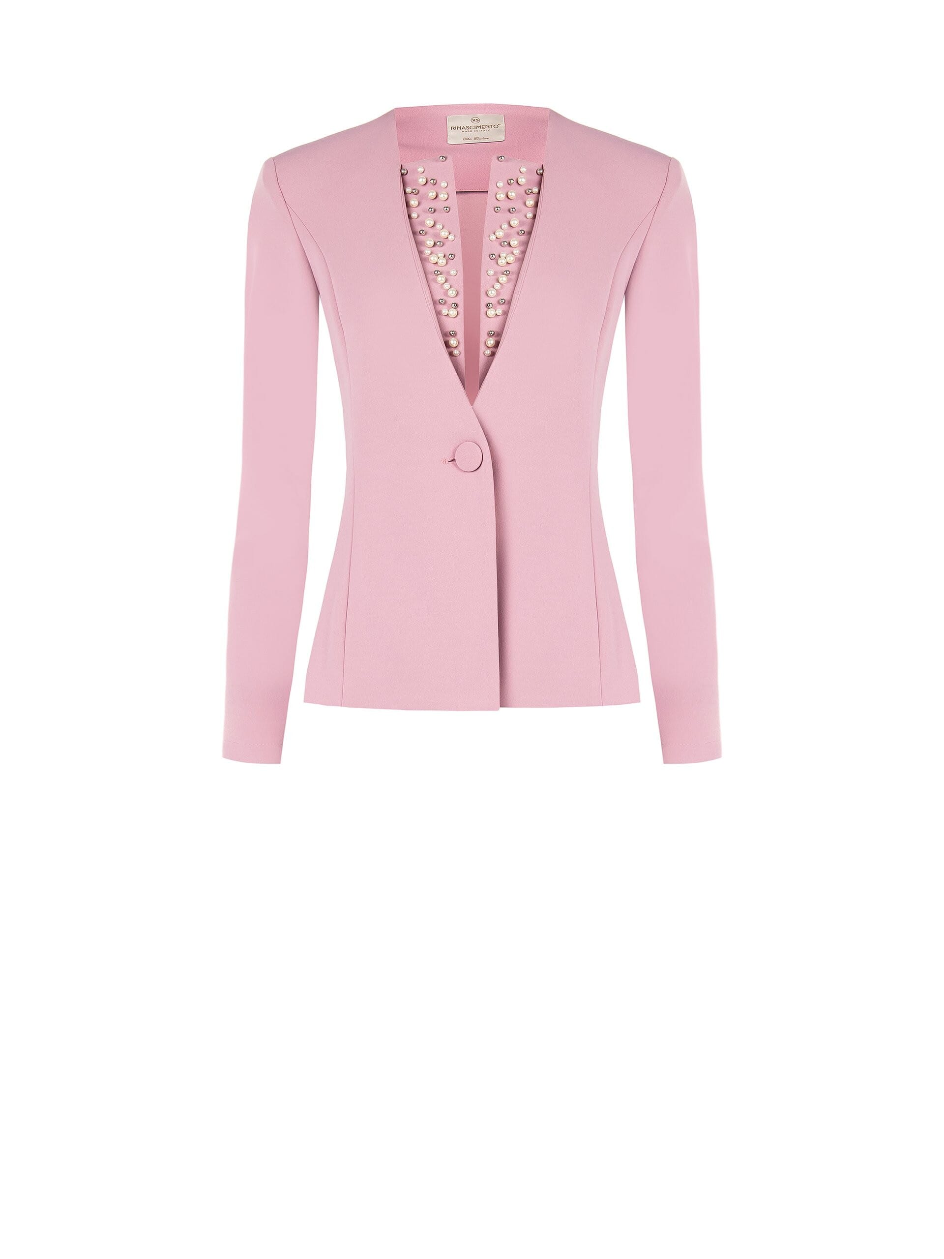 Feminine blazer with a fitted but comfortable fit. Made of stretch scuba crepe for a defined silhouette. Deep V-neckline with pearl and micro-rhinestone appliqués; single-breasted covered fastening. Perfect for office and ceremonies, it gives instant elegance even over denim.