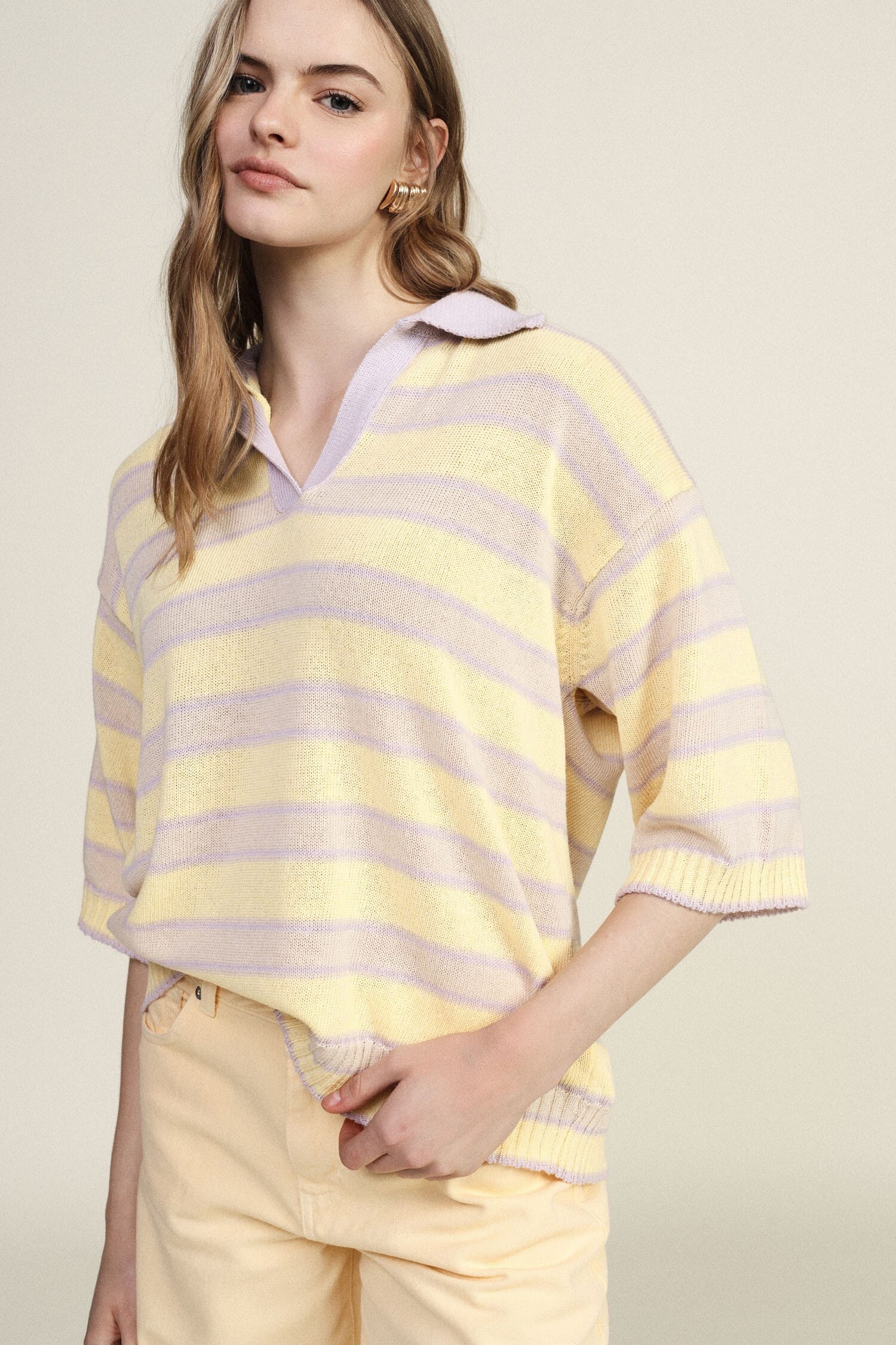 This striped top instantly adds character to your look thanks to its relaxed cut and classic collar and v-neck design. Short sleeves ensure all-day comfort, perfect for tucking into jeans or wearing loose with loose trousers. Delicate details enhance your everyday style with lightness.