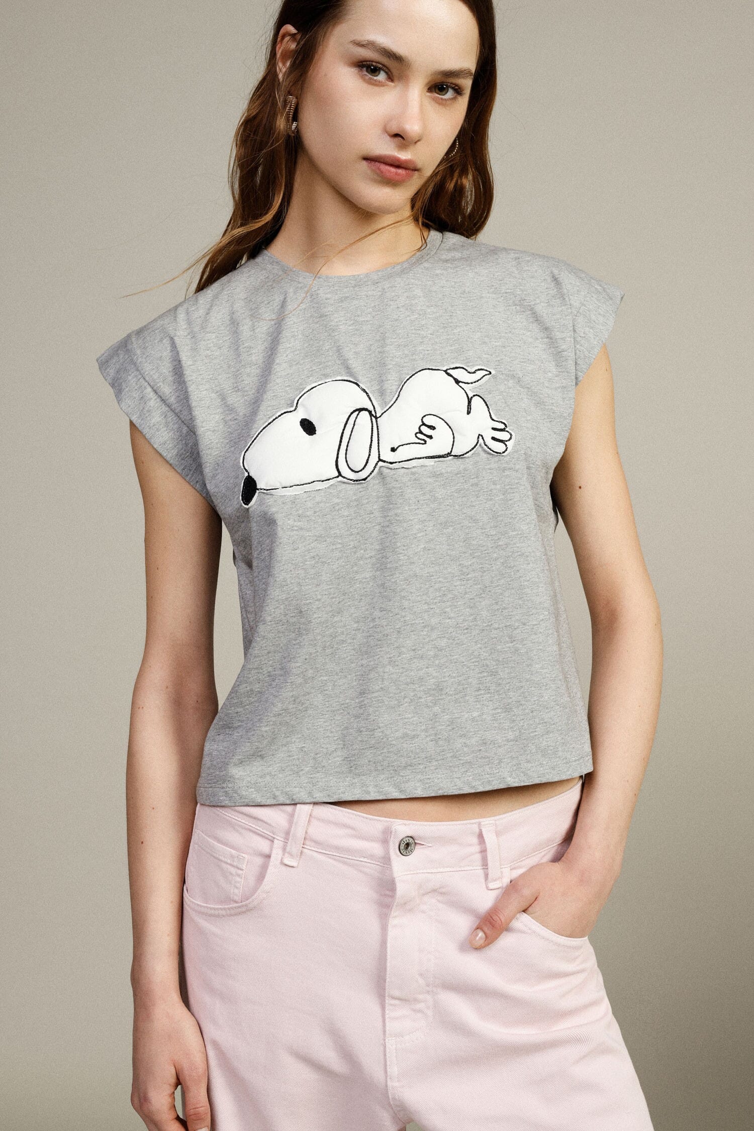 This loose-fitting short-sleeved T-shirt is characterised by a frontal print of lying snoopy. The slightly broad shoulders and straight cut provide perfect comfort for both leisure and casual looks. Worn with jeans or skirts, it is perfect for a fun, relaxed style every day.