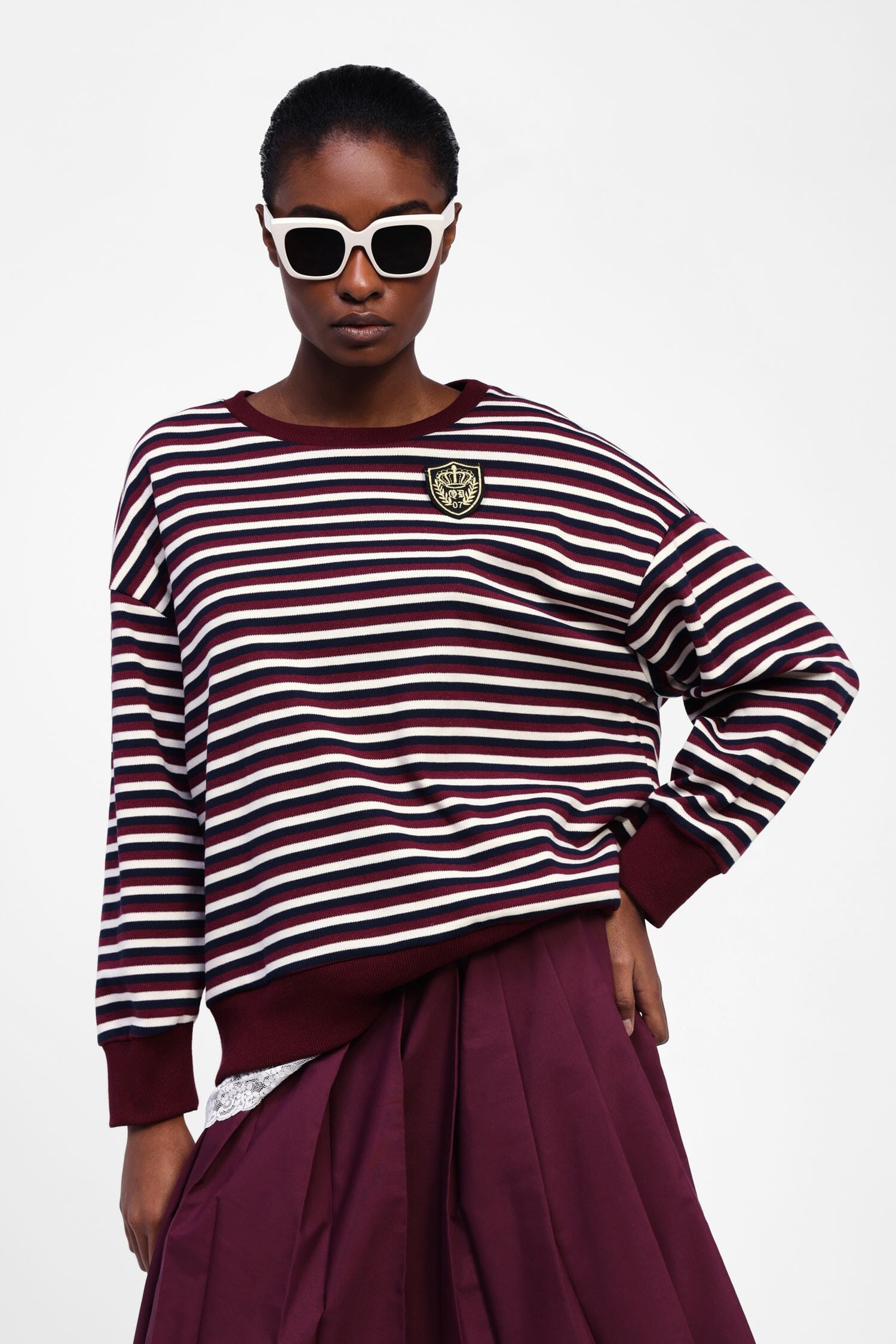 Striped sweatshirt with round neckline Add a touch of joy to your wardrobe with this striped sweatshirt. A classic round neckline and long sleeves offer timeless comfort. Perfect for those who like a casual yet detailed look, this sweatshirt is an invitation to everyday creativity. Mix and match freely to express your unique style.