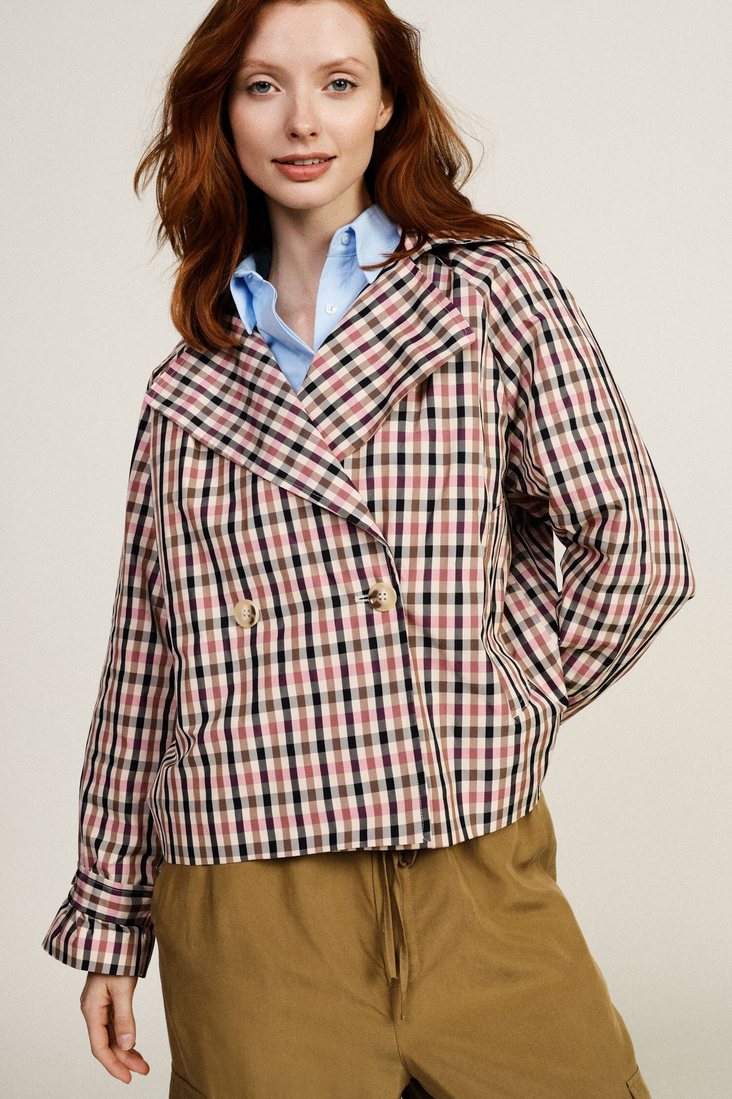 This checked shirt-jacket accompanies you on days of uncertain weather with its short, double-breasted cut. The long sleeves and wide collar give it a feminine and sophisticated touch, perfect for those who like to stand out every day without sacrificing practicality. Button cuff detail.