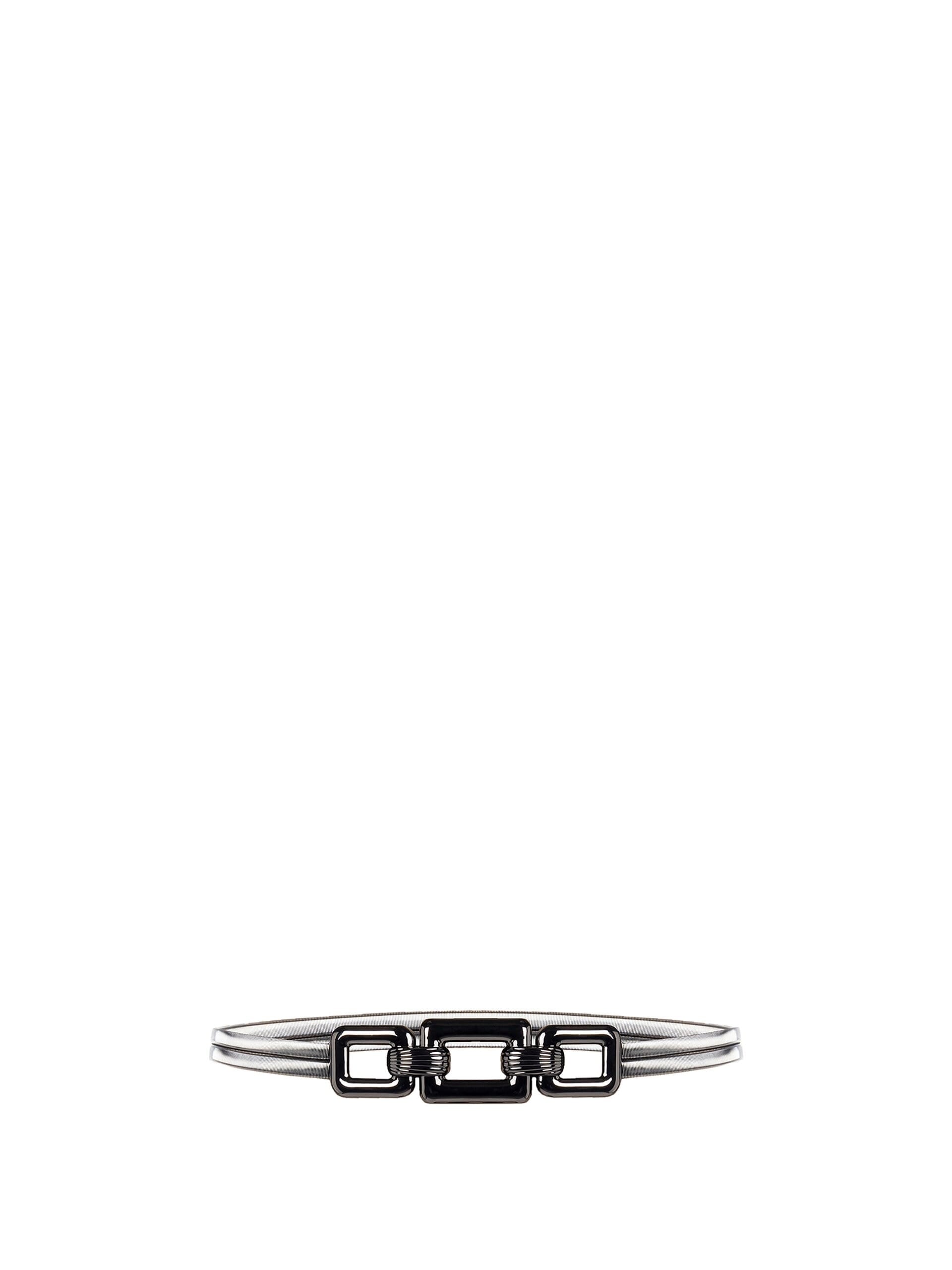 Narrow waistband, elastic fit that defines the silhouette without being tight. Flexible metal band with a shiny finish, pleasant and light. Front fastening with geometric mesh and striped texture. Perfect for finishing dresses and blazers: from the office to the aperitif, it adds character with discretion.