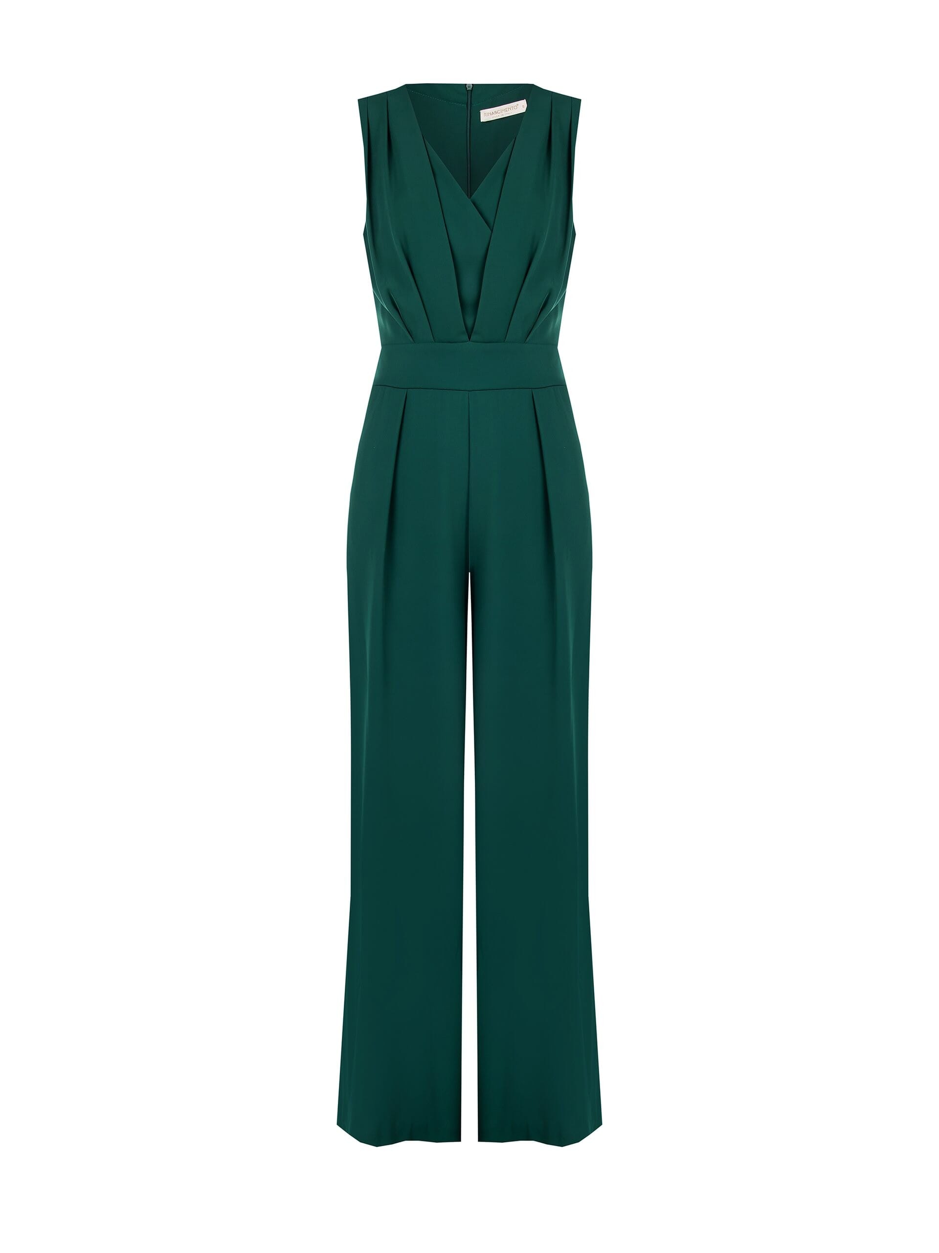 Elegant jumpsuit with wide leg, soft fit that slims the silhouette. Made of fluid and light fabric, it falls with natural movement. Criss-cross bodice with V-neck and draping, bow at the back that defines the waist. Perfect for ceremonies, parties and evenings, but also versatile for the office with blazer.