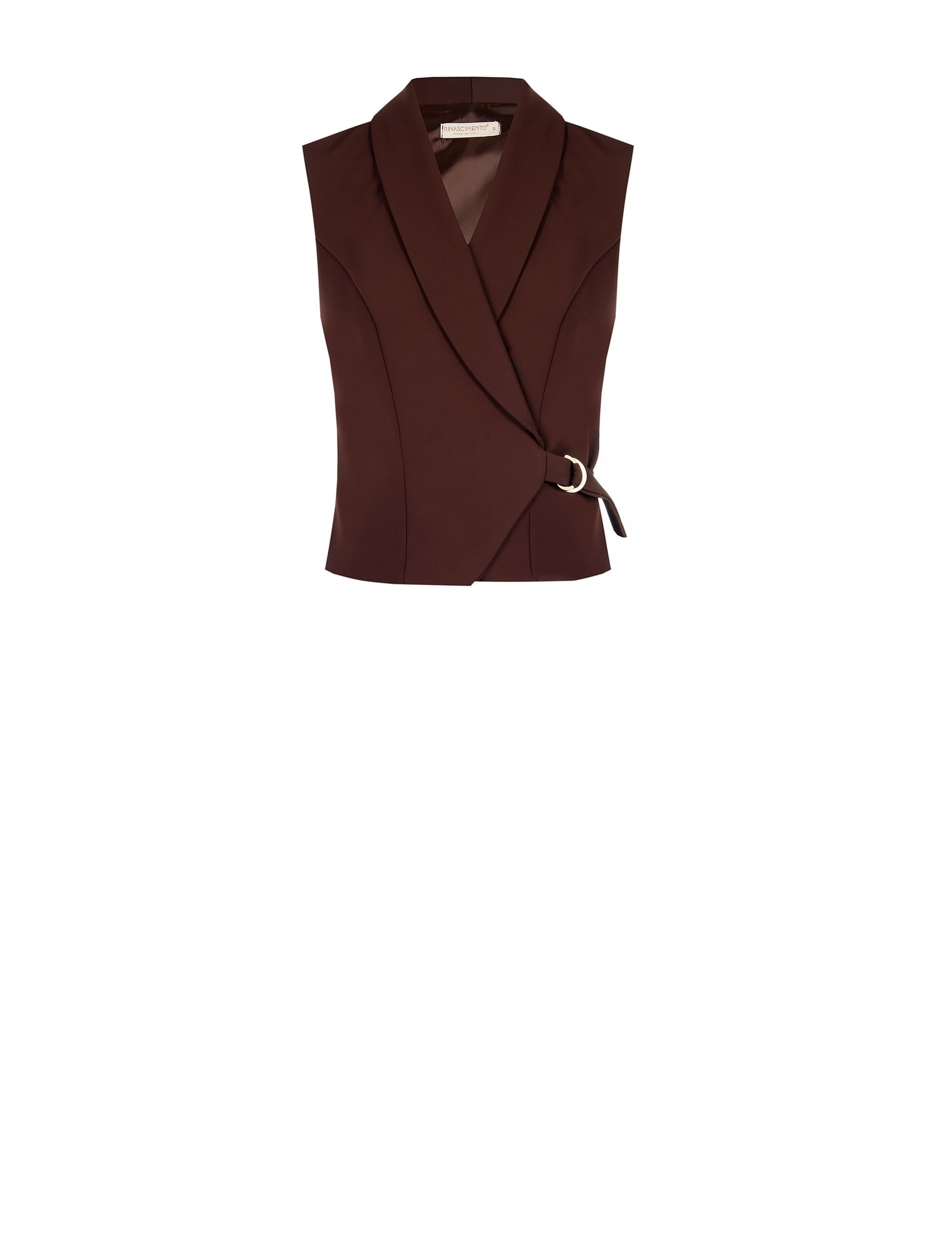 Sleeveless top with a slim and feminine fit, in a fluid fabric with a smooth texture that accompanies the silhouette with comfort. The lapel neckline and cross-over closure with side buckle define the waist. Perfect in the office, for an aperitif or in the most polished everyday looks.