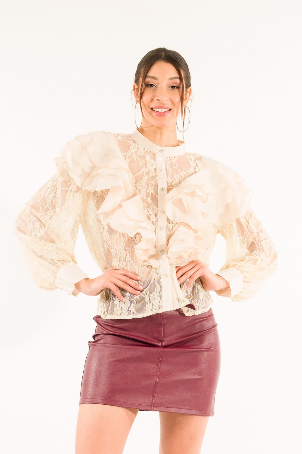 Kontatto signs a blouse with a soft fit that enhances the silhouette without constricting it. Light lace and refined transparencies with delicate textures. Character thanks to front flounces and jewelled buttons on the mandarin collar. Perfect for aperitifs, parties and versatile evening looks.