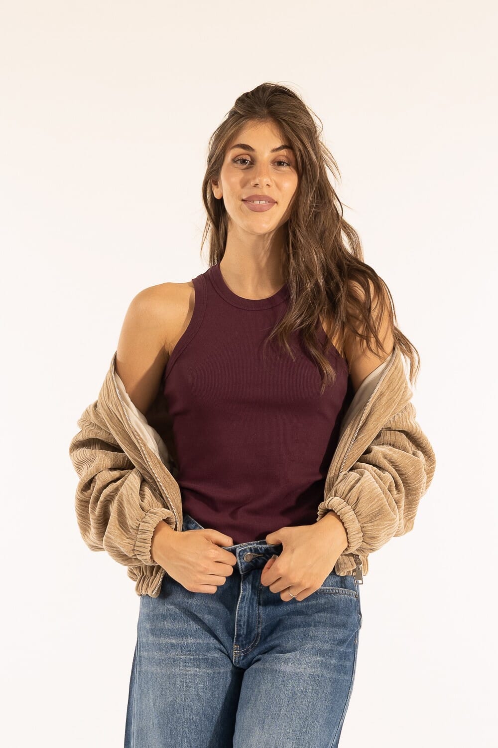 Kontatto signs a ribbed top with a tight fit that enhances the silhouette without constricting. Stretch knit, soft hand and breathable. Open shoulders with racer cut and trimmed edges for a clean line. Perfect on its own with denim for everyday wear or under a blazer in the office.