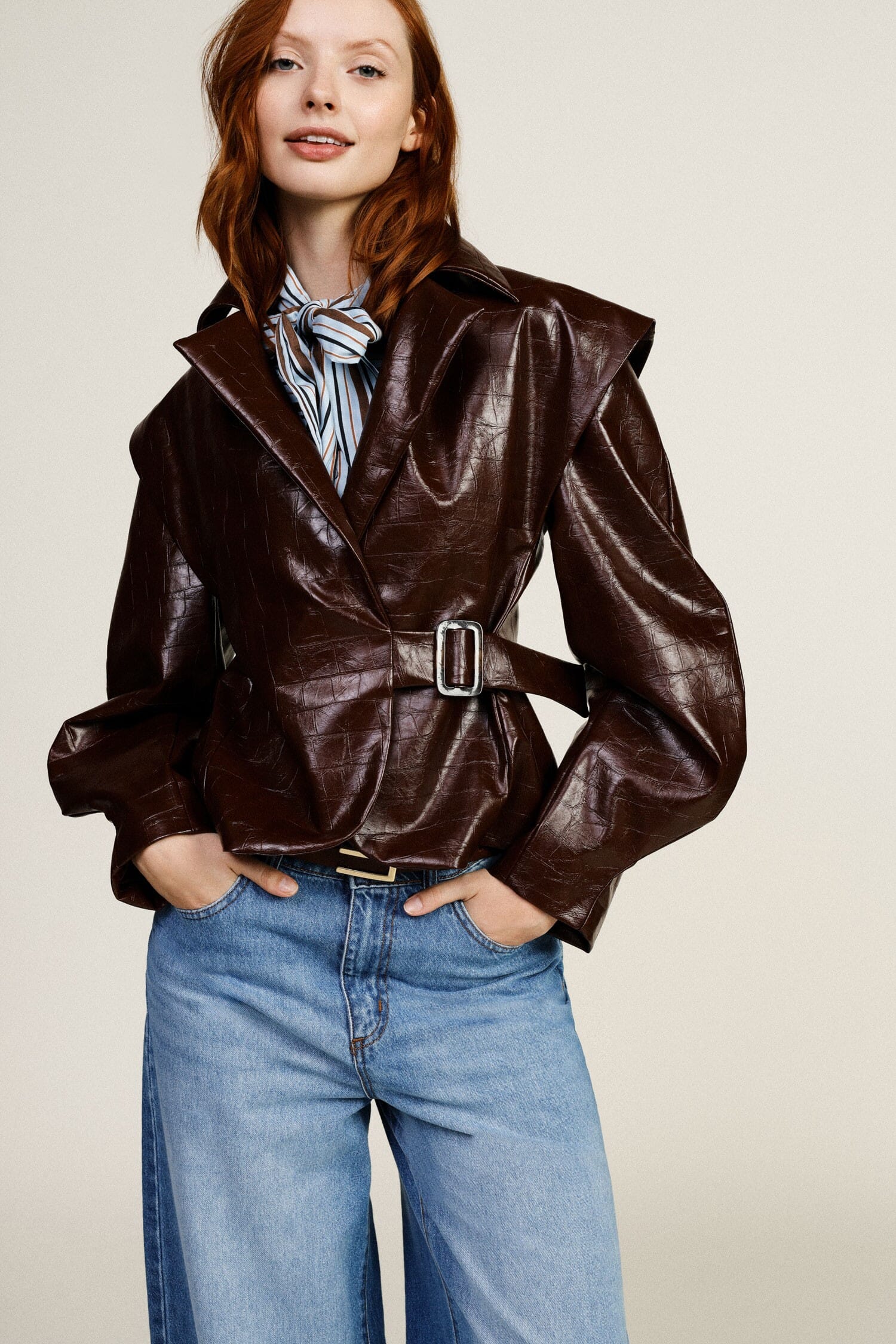 Leatherette jacket with belt and broad shoulders