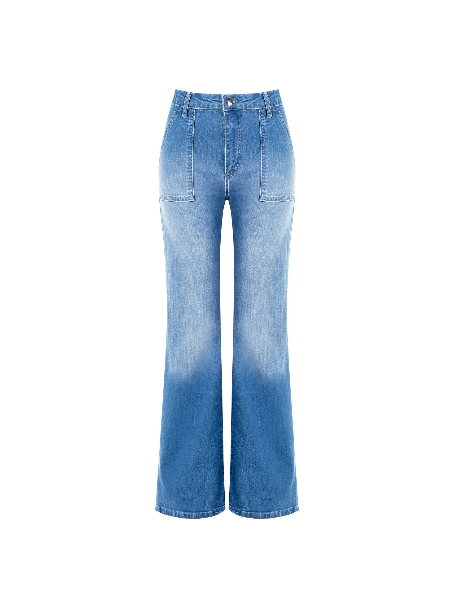 Soft denim trousers with a slight stretch component, with a straight line that accompanies the silhouette with comfort and slims the figure. The maxi patch pockets on the front and the button and zip fastening add character. Perfect from the office to leisure time.