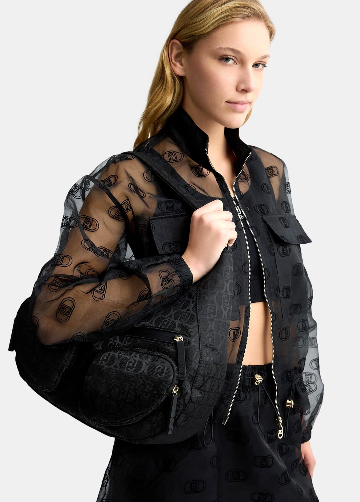 Shoulder bag in nylon jacquard, embroidered logo patch on the front.