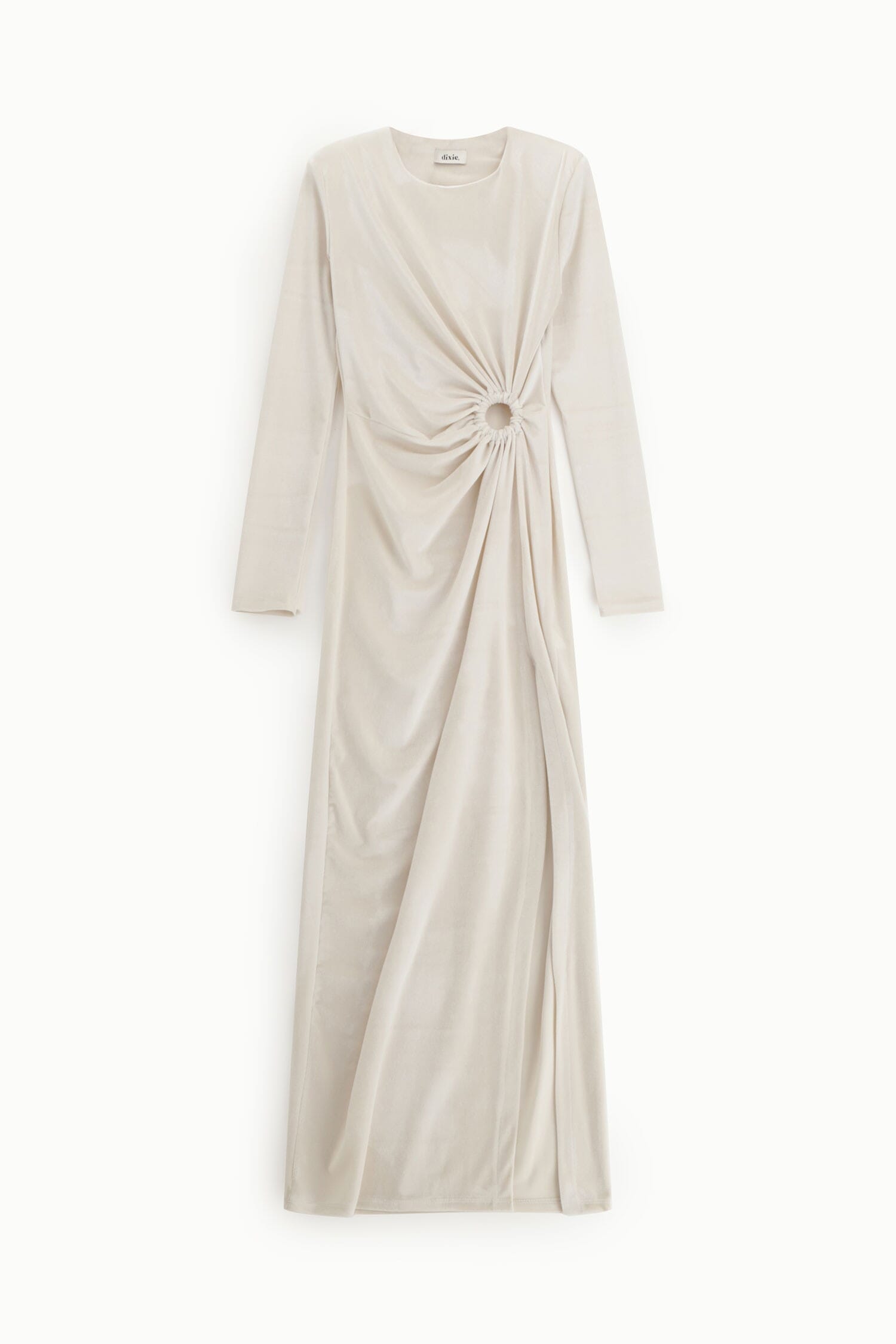 Be surprised by this long dress with front slit and side cut-out detail that enhances the silhouette. The play of draping makes every movement harmonious, perfect for special evenings or events where you want to feel unique. The long sleeves and clean lines make it versatile and refined.