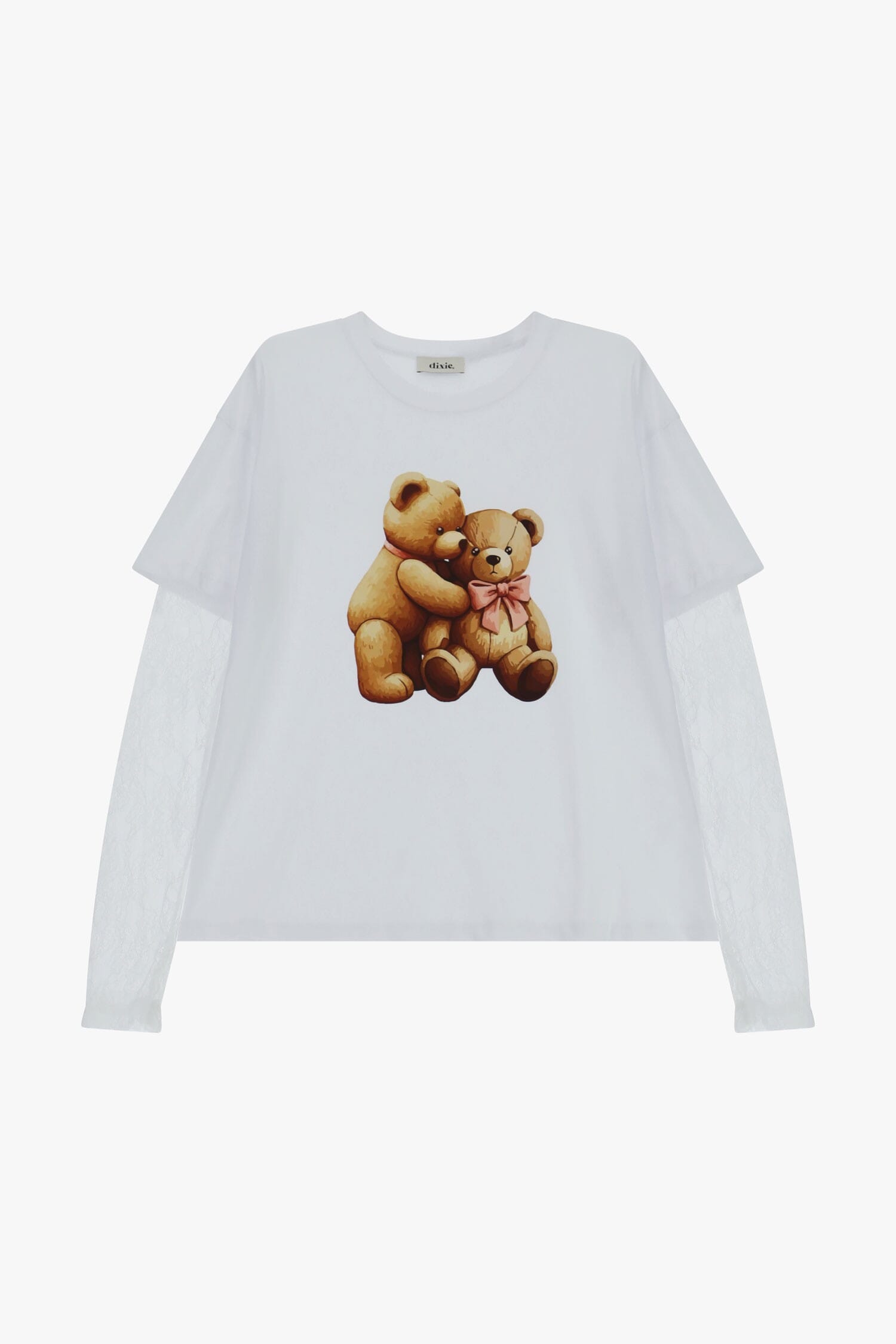 Long-sleeved T-shirt with teddy bears and lace sleeves