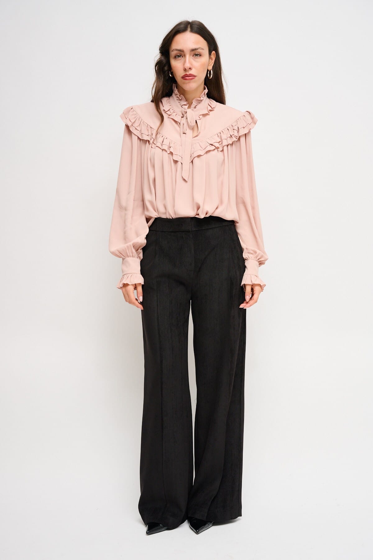 Maryley offers a loose, flowing model with a soft fit that slims the silhouette. Lightweight fabric with herringbone texture, pleasant on the skin. Clean waist with front pleats and side pockets for discreet comfort. Perfect from the office to the aperitif, for refined and versatile looks.