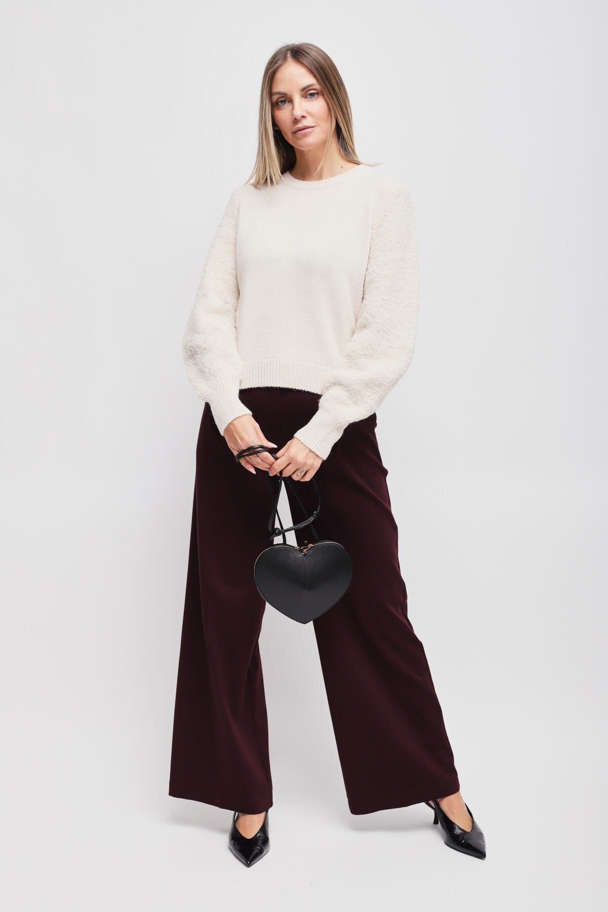 Maryley signs a soft, regular fit and feminine pullover. Fine knit body with soft bouclé sleeves for a pleasant contrast of textures. Clean crew neck and wrap-around ribbed cuffs define the silhouette. Perfect for the office with loose-fitting trousers or for everyday wear with denim.