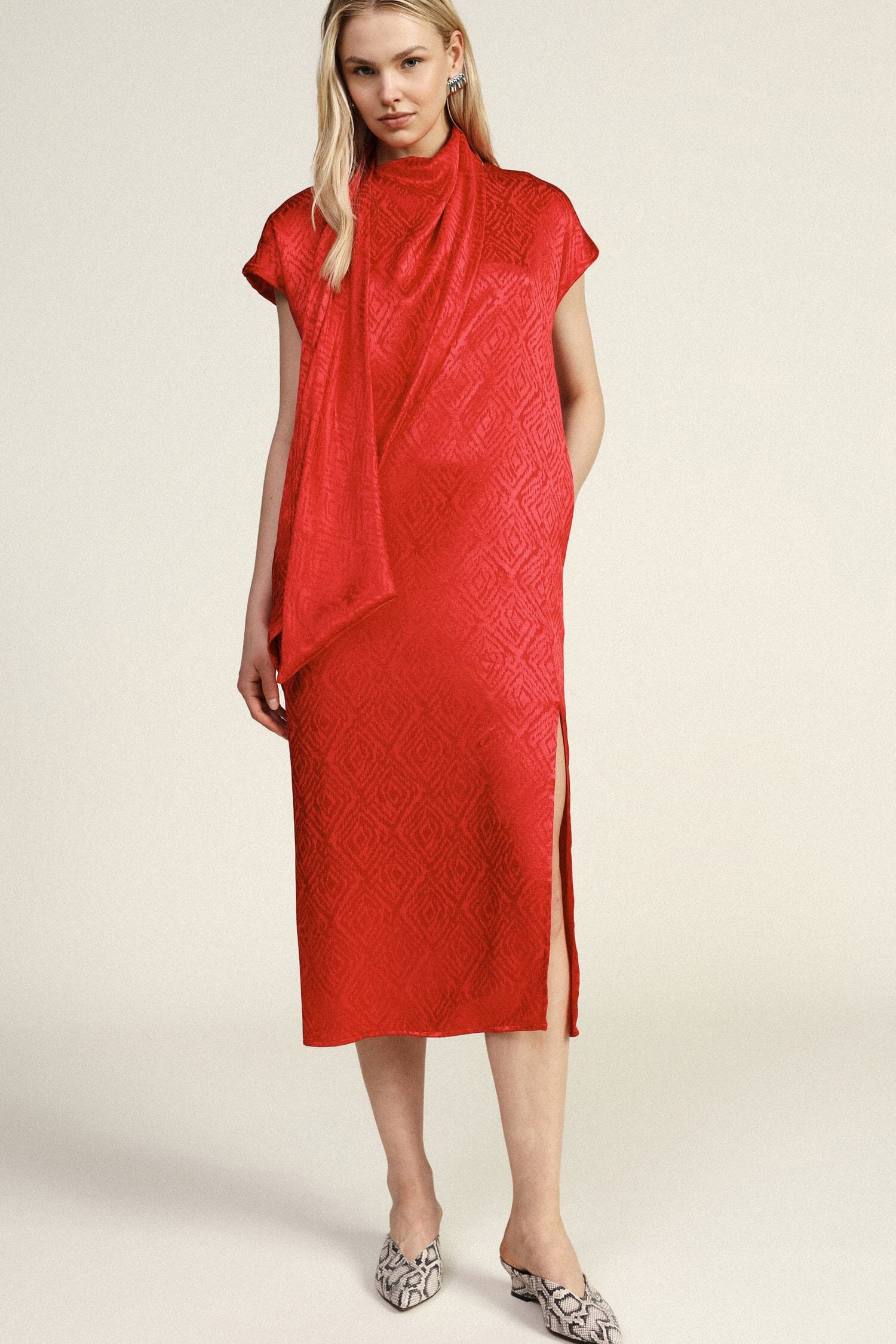 Discover the pleasure of wearing a midi dress with an unmistakable style: the draped collar gives movement, while the tone-on-tone geometric pattern adds an original touch. The soft line enhances every silhouette and the midi length makes it ideal for both everyday wear and special moments.
