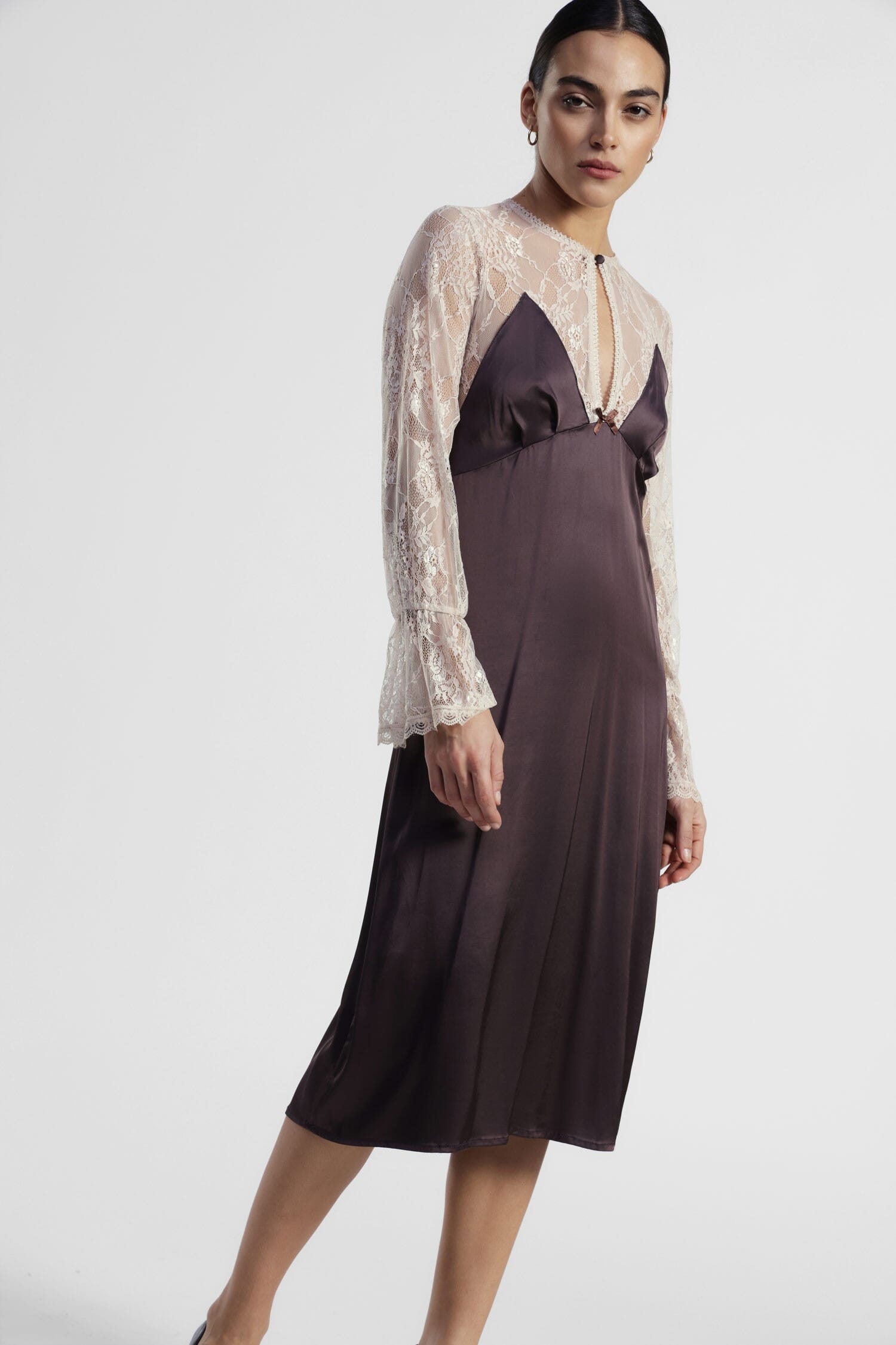 Sophisticated details such as the long sleeves in transparent lace and the soft line make this dress perfect for those who love a feminine and original style. The flared cut and the seam under the bust give a comfortable fit that suits every occasion, from a casual lunch to a special moment.