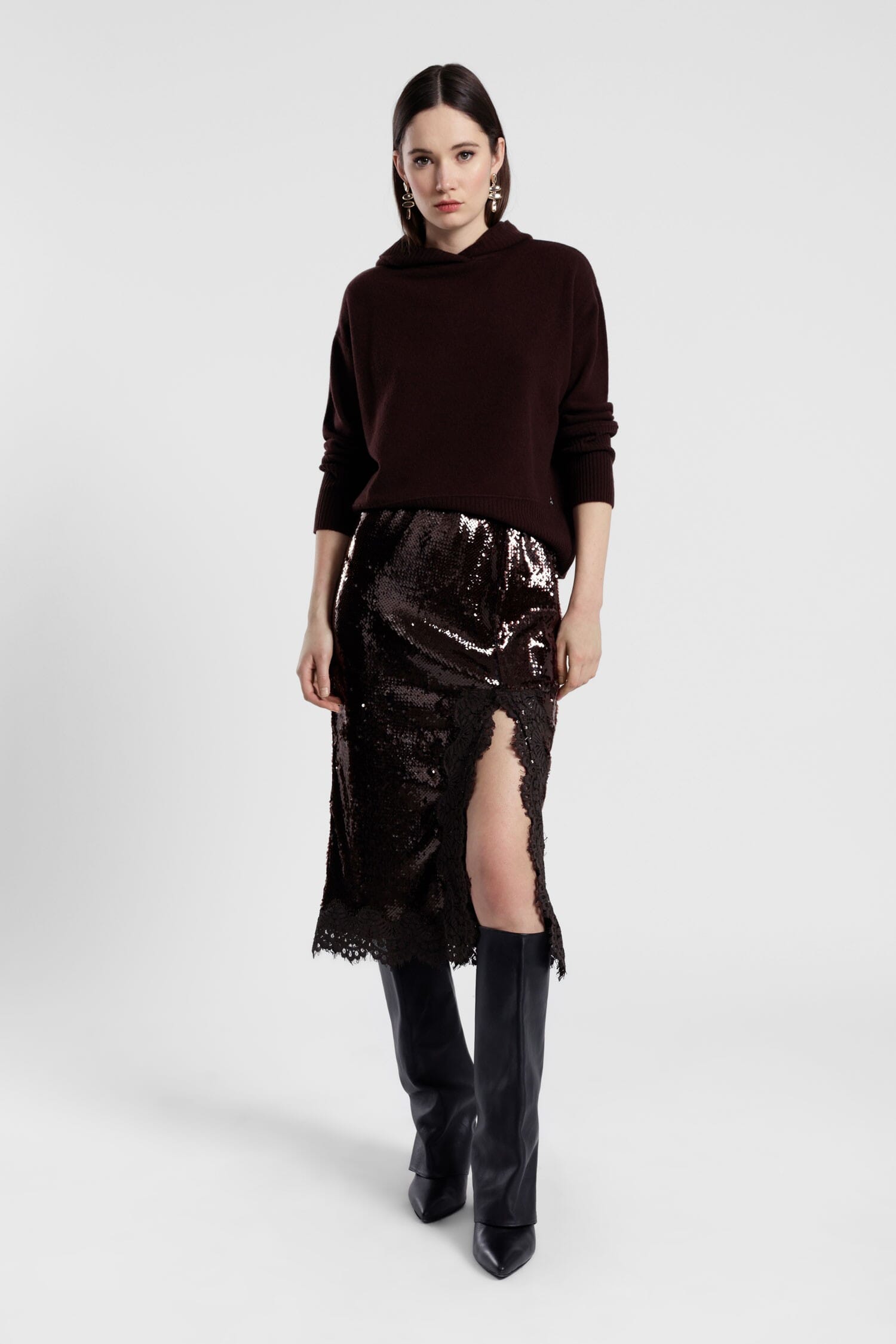 This midi skirt conquers with the brilliance of the sequins and the refined lace insert on the side. The straight cut enhances the silhouette while maintaining practicality and comfort for everyday wear. Imagine wearing it to add character to a simple knit or to complete more sophisticated looks.