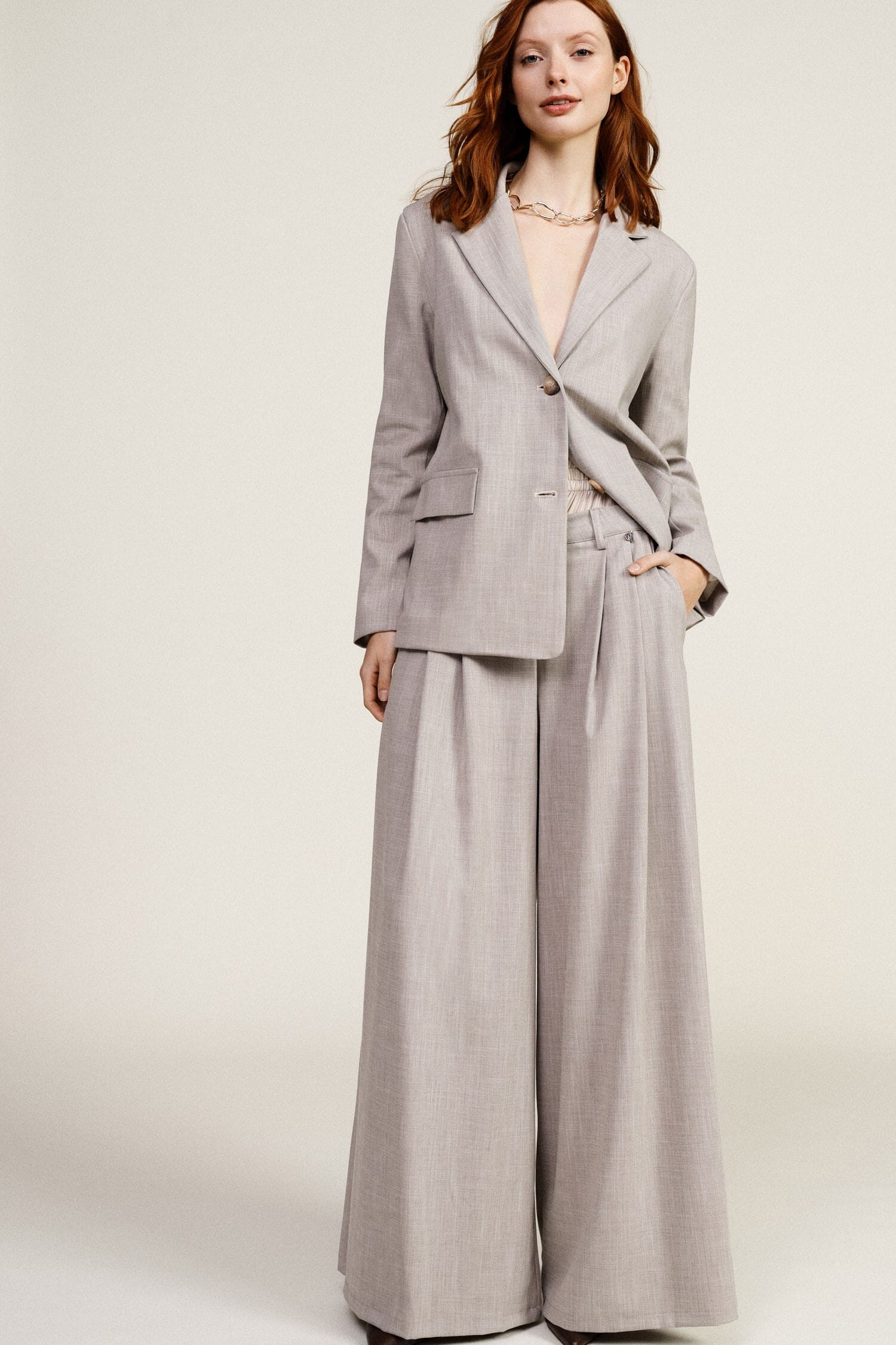 These palazzo trousers stand out for their loose, flowing silhouette, enhanced by deep front pleats that give movement with every step. The elasticated waistband with button detail ensures all-day comfort and adds an original touch. Perfect for those seeking style and practicality for every moment.