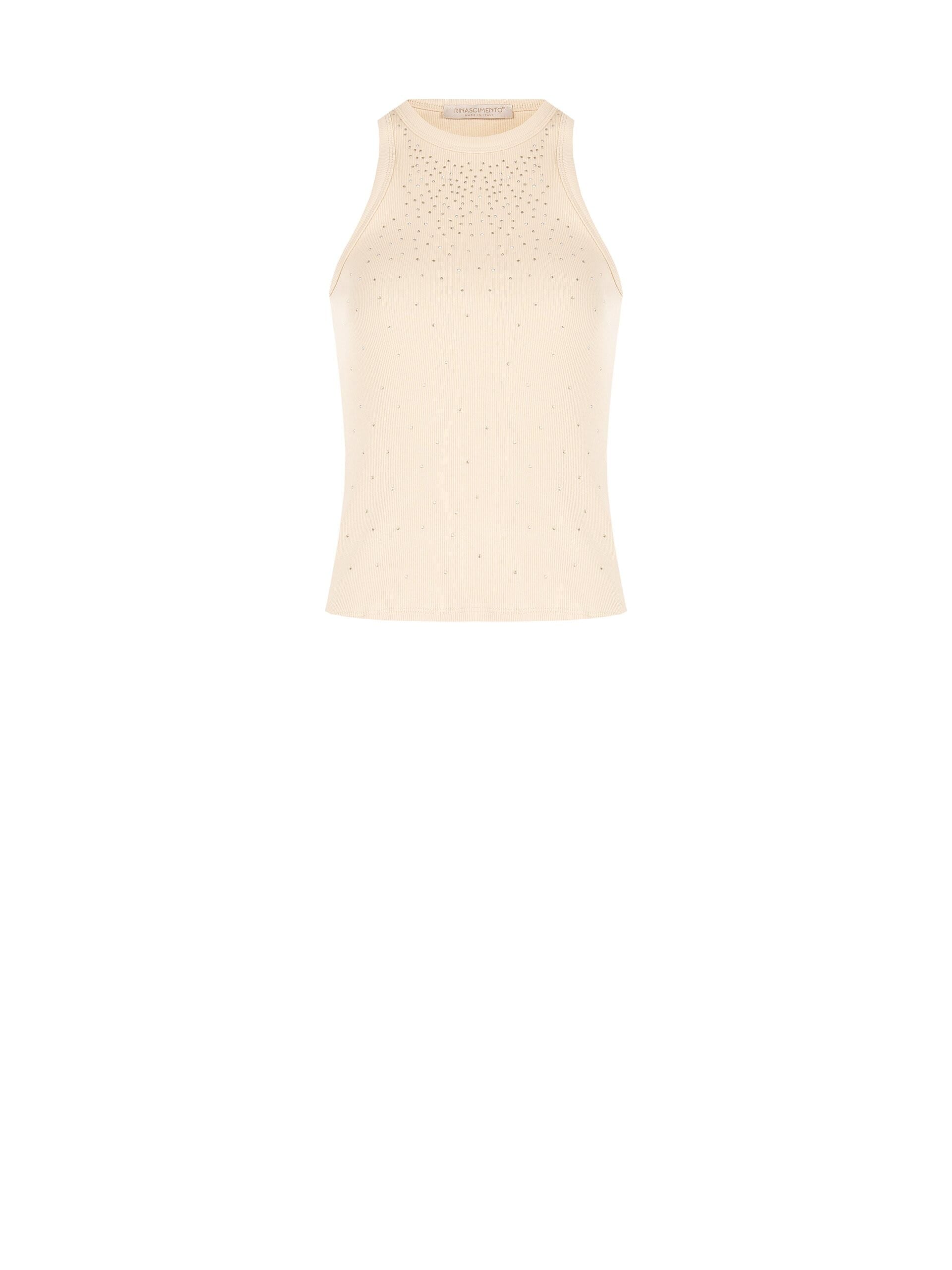 Rinascimento tank top in stretch cotton-blend ribbed knit, soft against the skin and perfect for tucking into high-waisted trousers and skirts. Applied rhinestones and an American-style neckline brighten up the look for evening, parties and events.