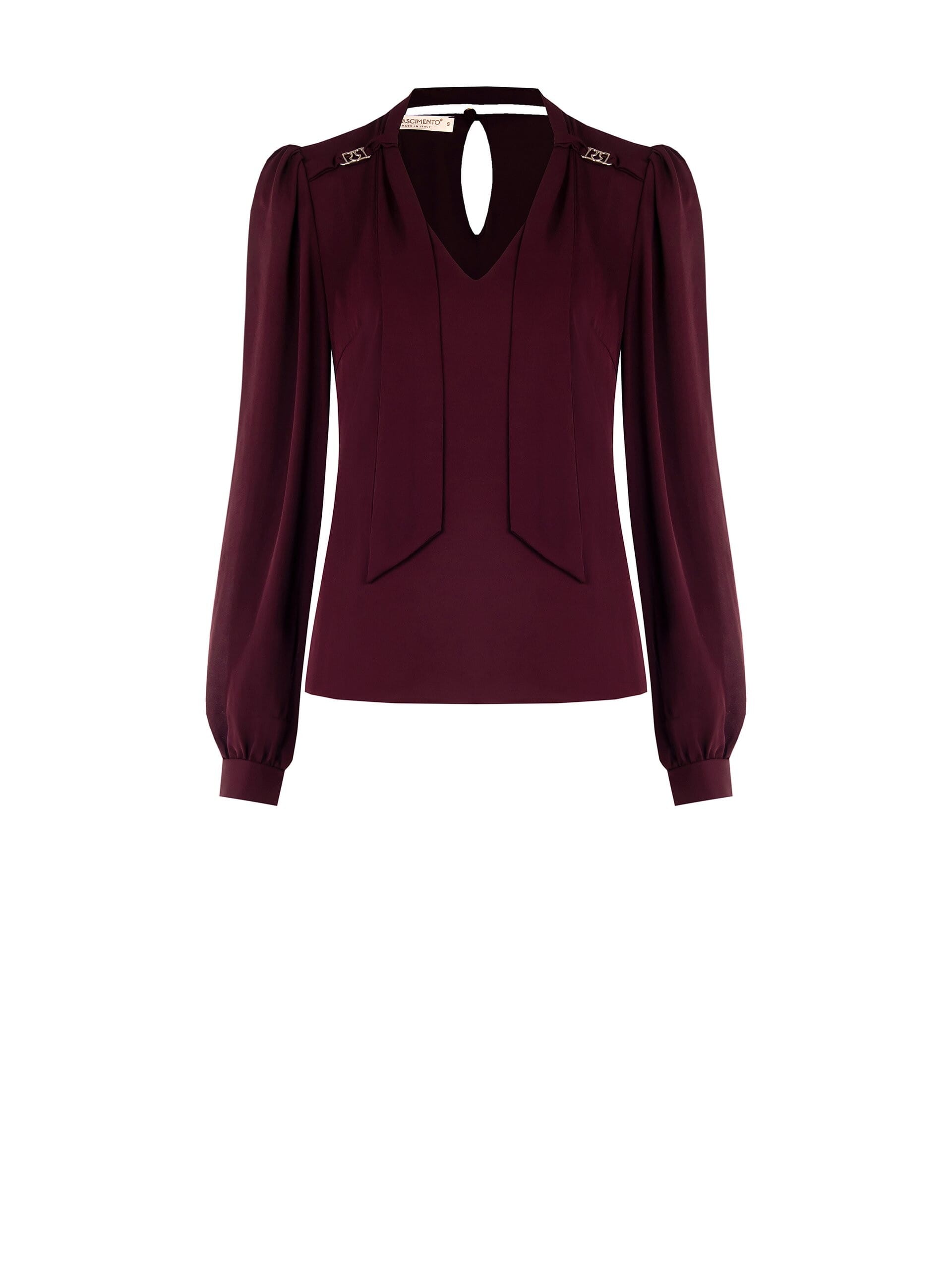Fluid top with a soft and feminine fit, in a light crepe fabric that is pleasant on the skin. V-neckline with tie-effect front bows and cut-out detail on the back; shoulders enhanced by small metal elements. Perfect for the office and aperitifs, it slips on easily and gives a slender silhouette.