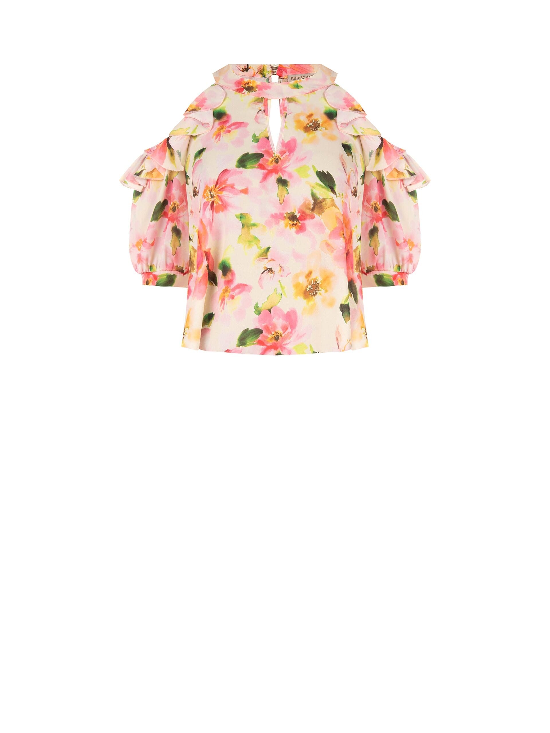 A softly feminine top in a fluid fabric with a light floral print. The drop neckline and ruffles on the shoulders enhance the silhouette, while the wide sleeves ensure comfort and movement. Perfect from the office to brunch, with versatile and sophisticated style.