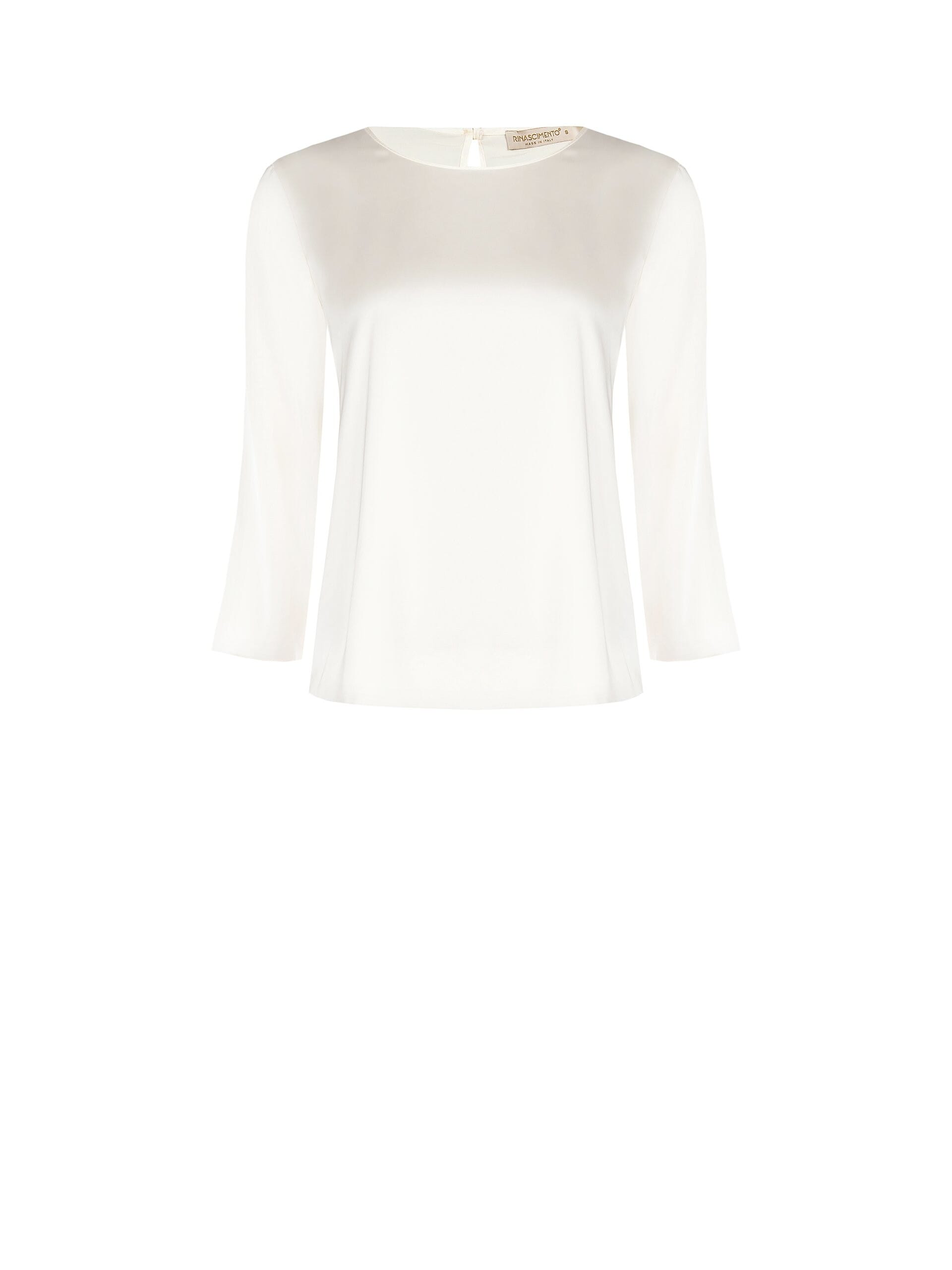 Straight, flowing line that caresses the silhouette, silk-effect slipped fabric with light sleeves. The small porthole on the back with double button adds a discreet feminine touch. Perfect with suits in the office and with denim for the aperitif.