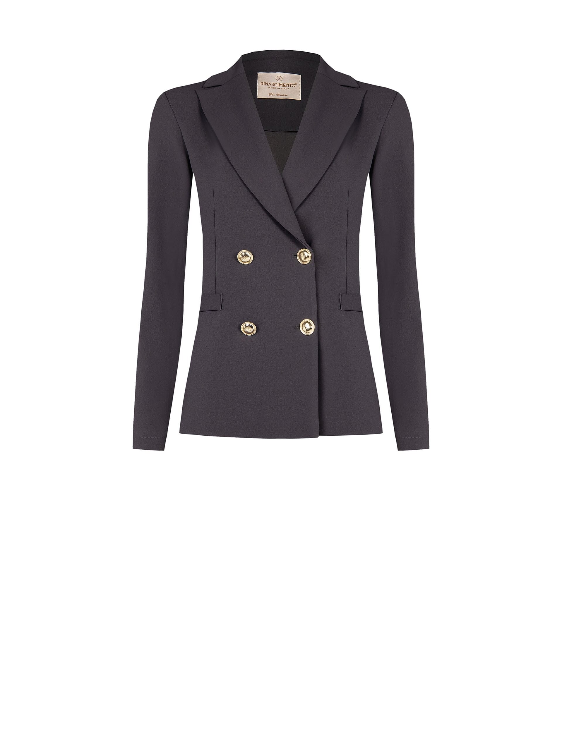 Feminine fitted blazer that sculpts the silhouette. Made of scuba crepe: elasticity and comfort all day long. Peaked lapels and double-breasted with shiny metal buttons, welt pockets. Perfect for the office and smart evenings with denim or tailored trousers.