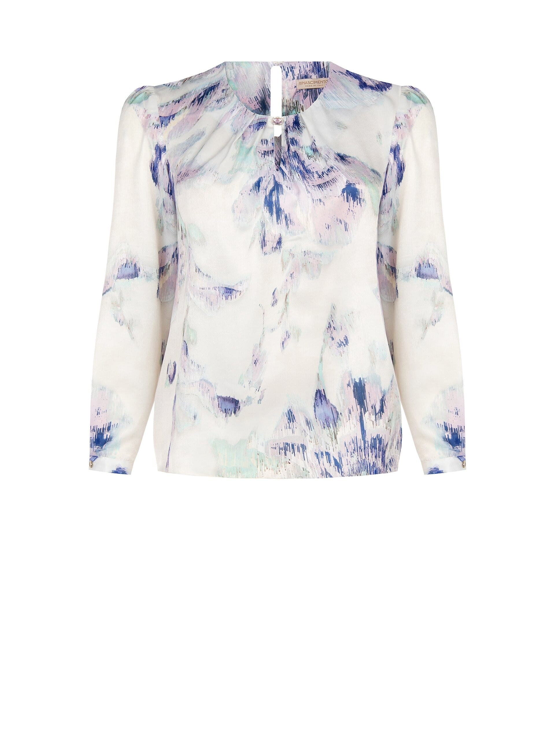 Soft line that caresses the shape, in fluid and light fabric with a silky effect. Drop opening at front and back with jewelled button, long sleeves with cuff. Perfect with trousers or skirt for the office, aperitifs or everyday outings.