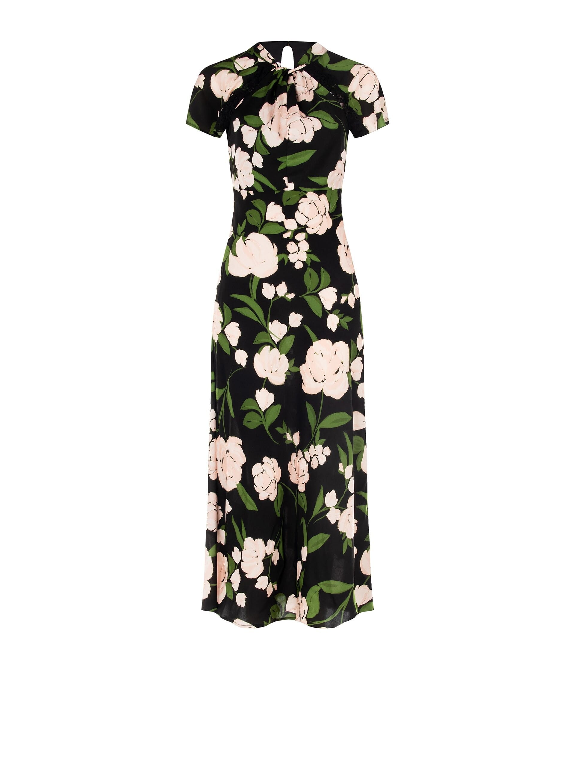 Slimming midi silhouette in fluid silk-effect fabric with botanical print. Knotted collar with small drop and lace inserts on the shoulders, short sleeves. Comfortable and light, it enhances the waist and accompanies movement. Perfect for the office with blazer, ideal for ceremonies and cocktail parties. Rinascimento.