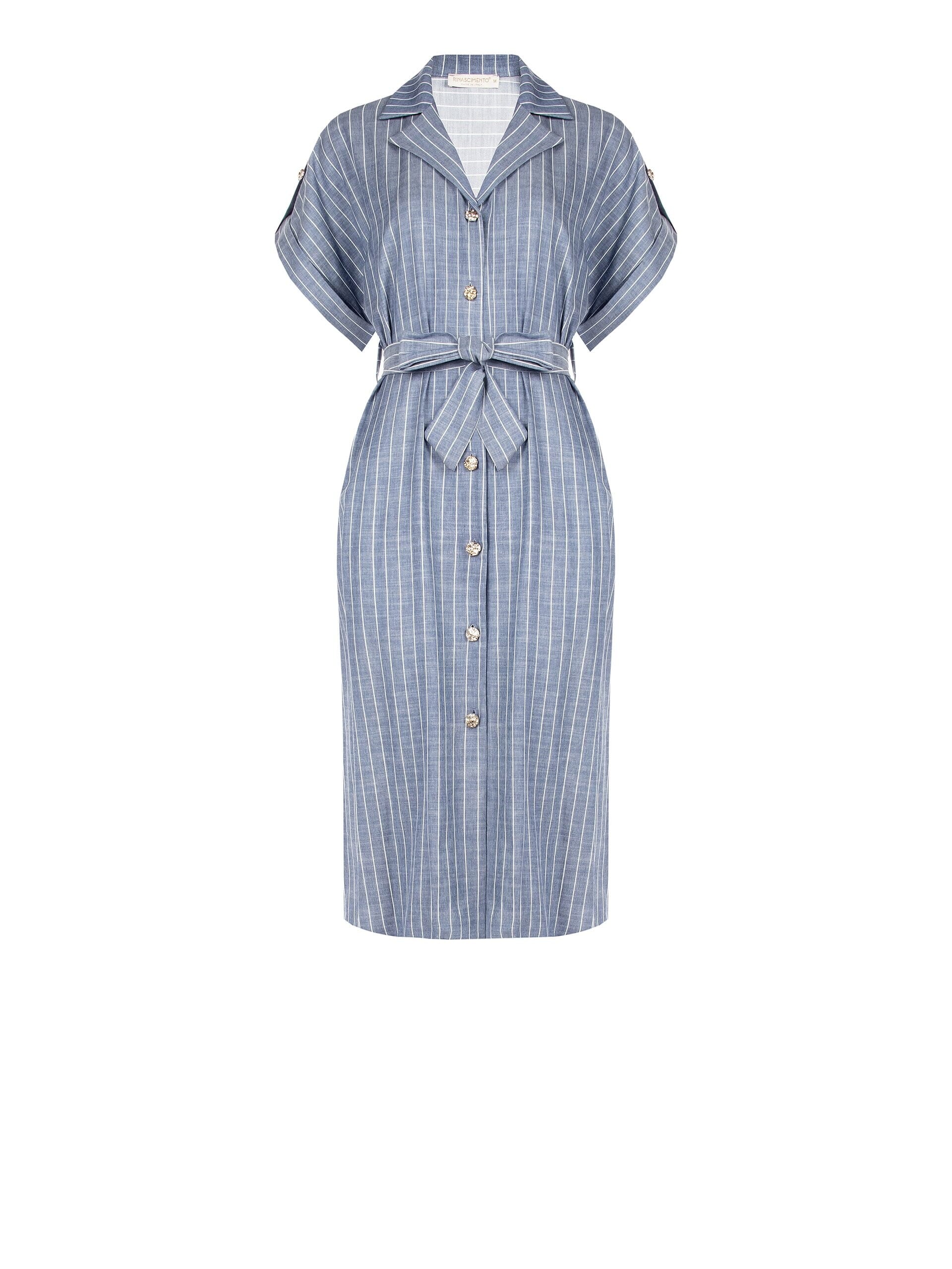 Chemisier midi line, soft adjustable fit with waistband. Made from a light fabric with thin stripes, it offers freshness and freedom of movement. Lapel collar, jewelled buttons and cuffed sleeves make it perfect from the office to city brunch.
