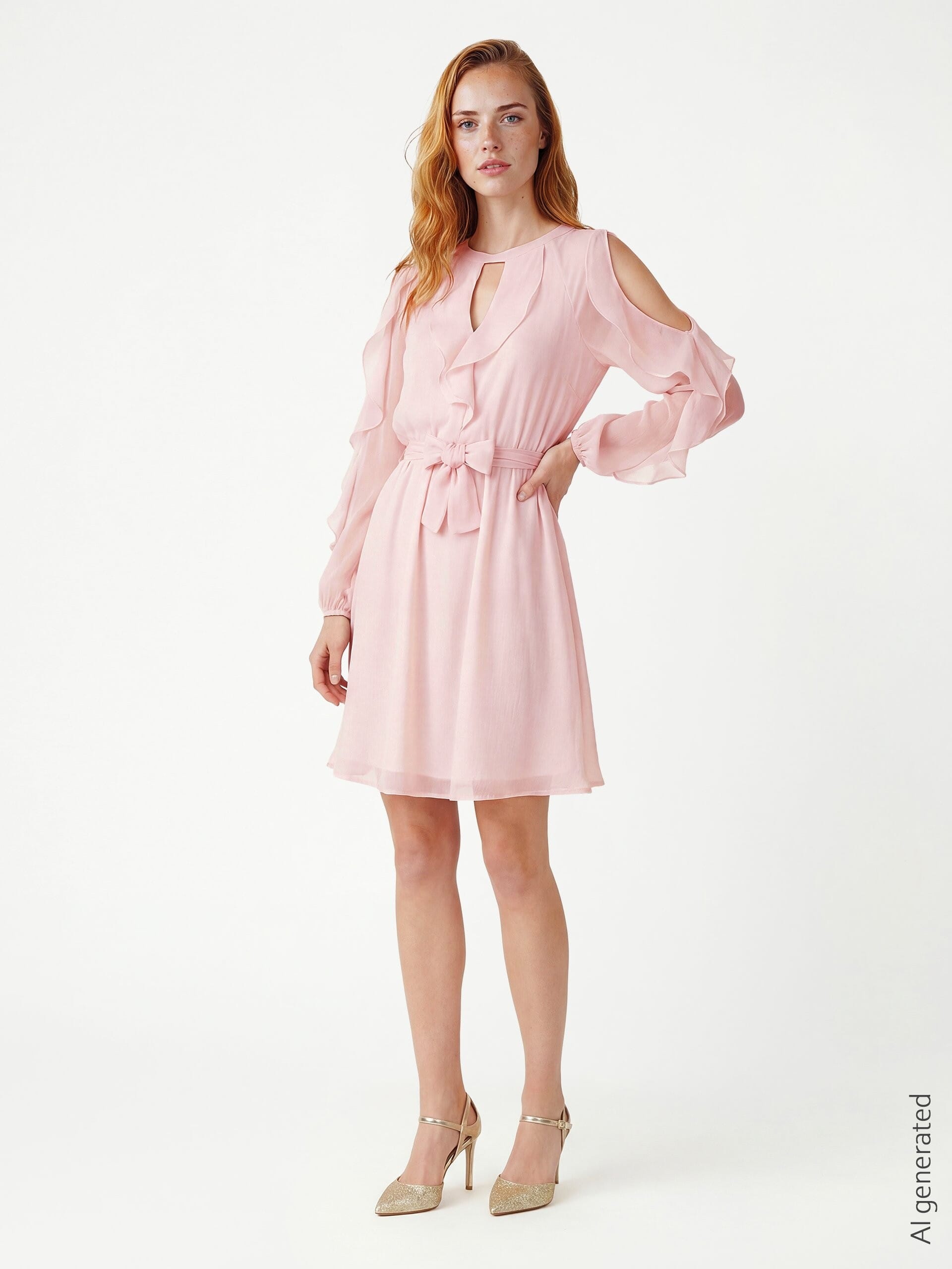 A short model with a soft and airy line, in a light fabric with a fluid texture. The drop neckline and sleeves with exposed shoulders and ruffles add movement, while the belt with bow enhances the waist. Perfect for parties, ceremonies and special dinners.