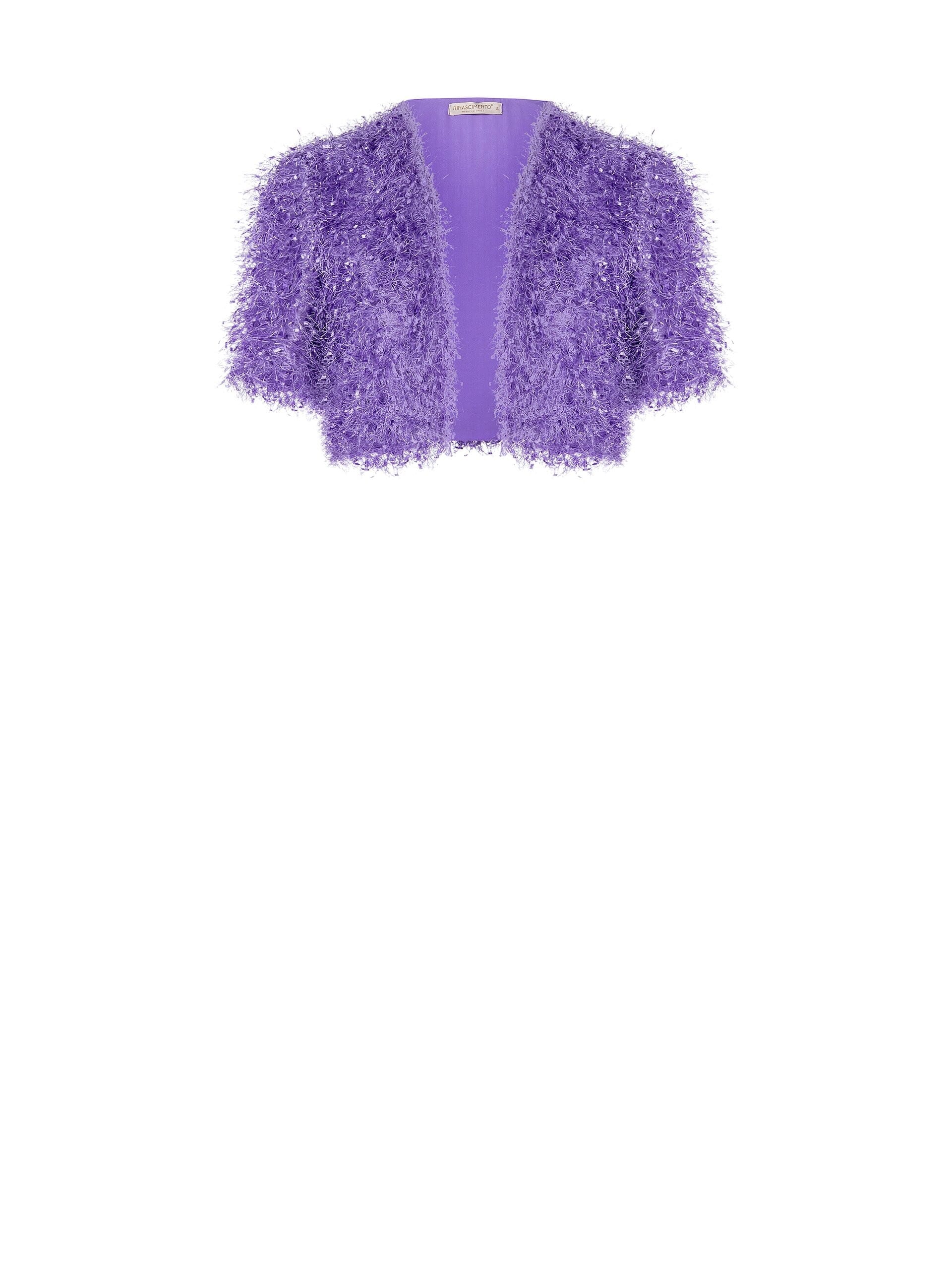 Short jacket with a soft fit, in a light-weight knit with feather-light threads. The front opening without fasteners and the short sleeves enhance the silhouette with comfort and movement. Perfect over dresses and tops for parties, ceremonies or special evenings.