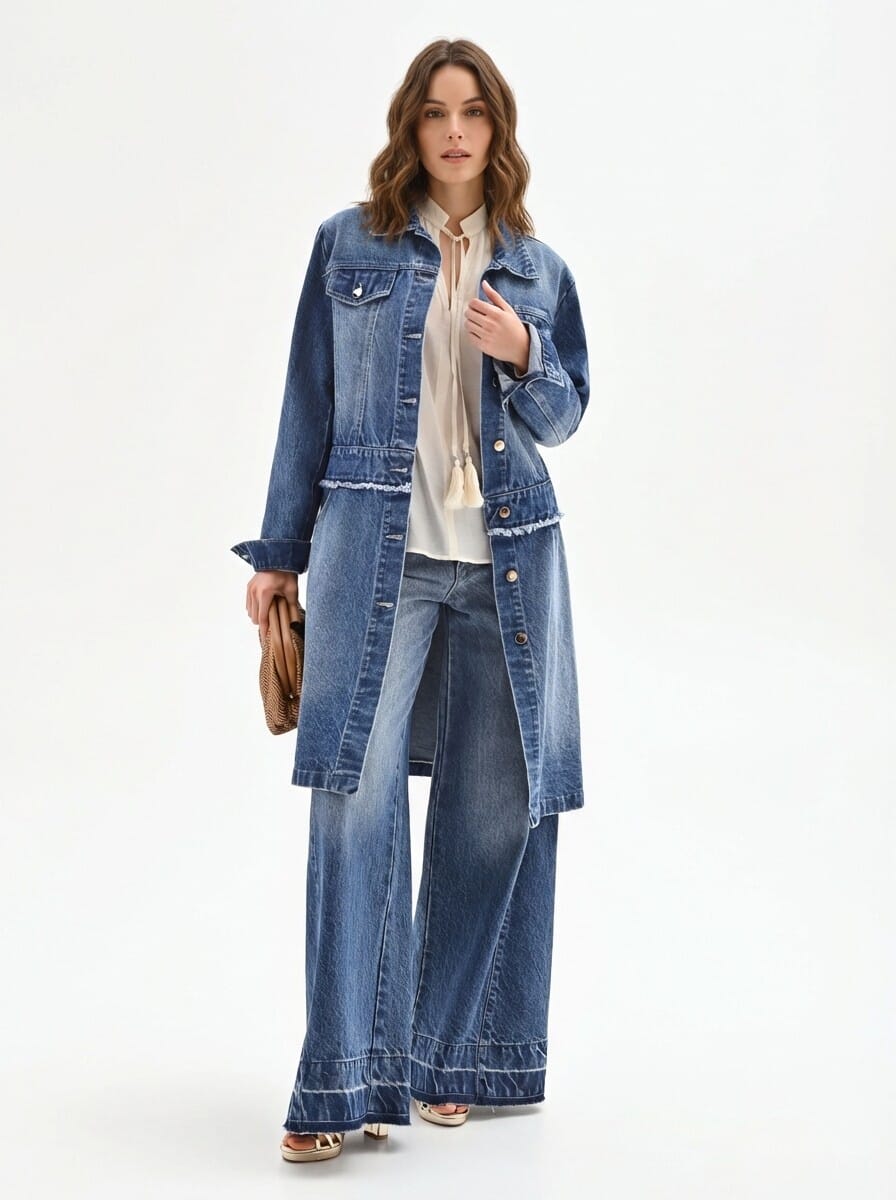 A straight, slightly slouchy denim outerwear in soft cotton with a distressed wash. The raw cut effect belt emphasises the waist, while metal buttons and flap pockets add character. Perfect on everyday outfits and city looks.