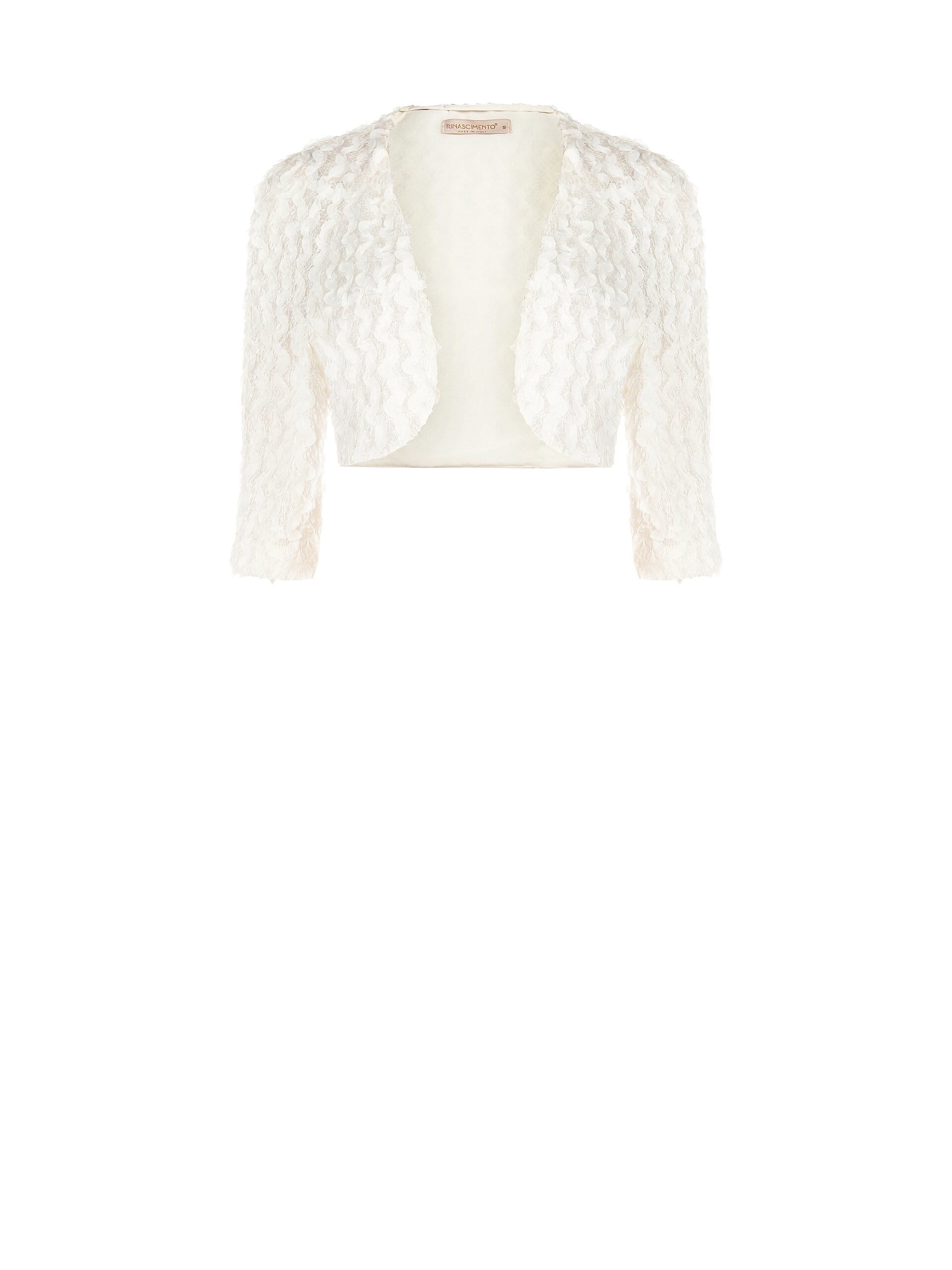 A figure-flattering short bolero in lace-effect fabric with wavy embossing. Three-quarter sleeves and a rounded opening without fastenings, for lightly layering over formal dresses, parties and evening events.