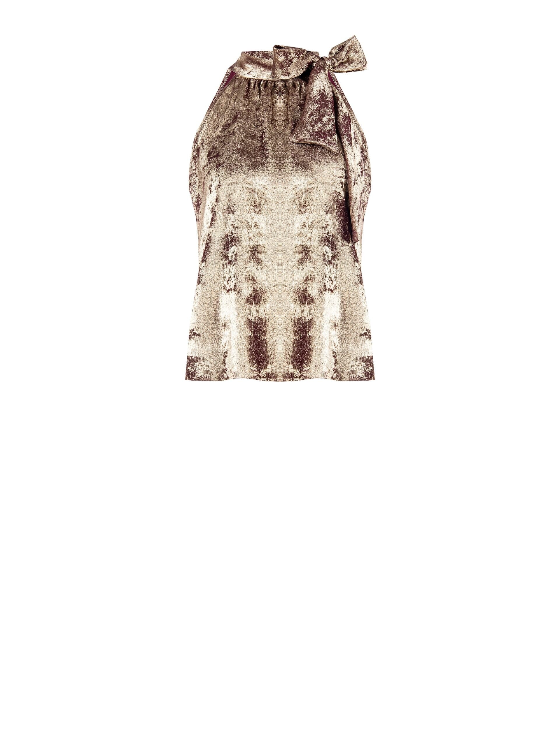 Fluid blouse with a slightly fitted line that caresses the silhouette. The laminated fabric, soft and light, illuminates the movements. High knotted collar with maxi bow and bare shoulders for a sensual touch. Perfect for parties, special dinners and aperitifs.