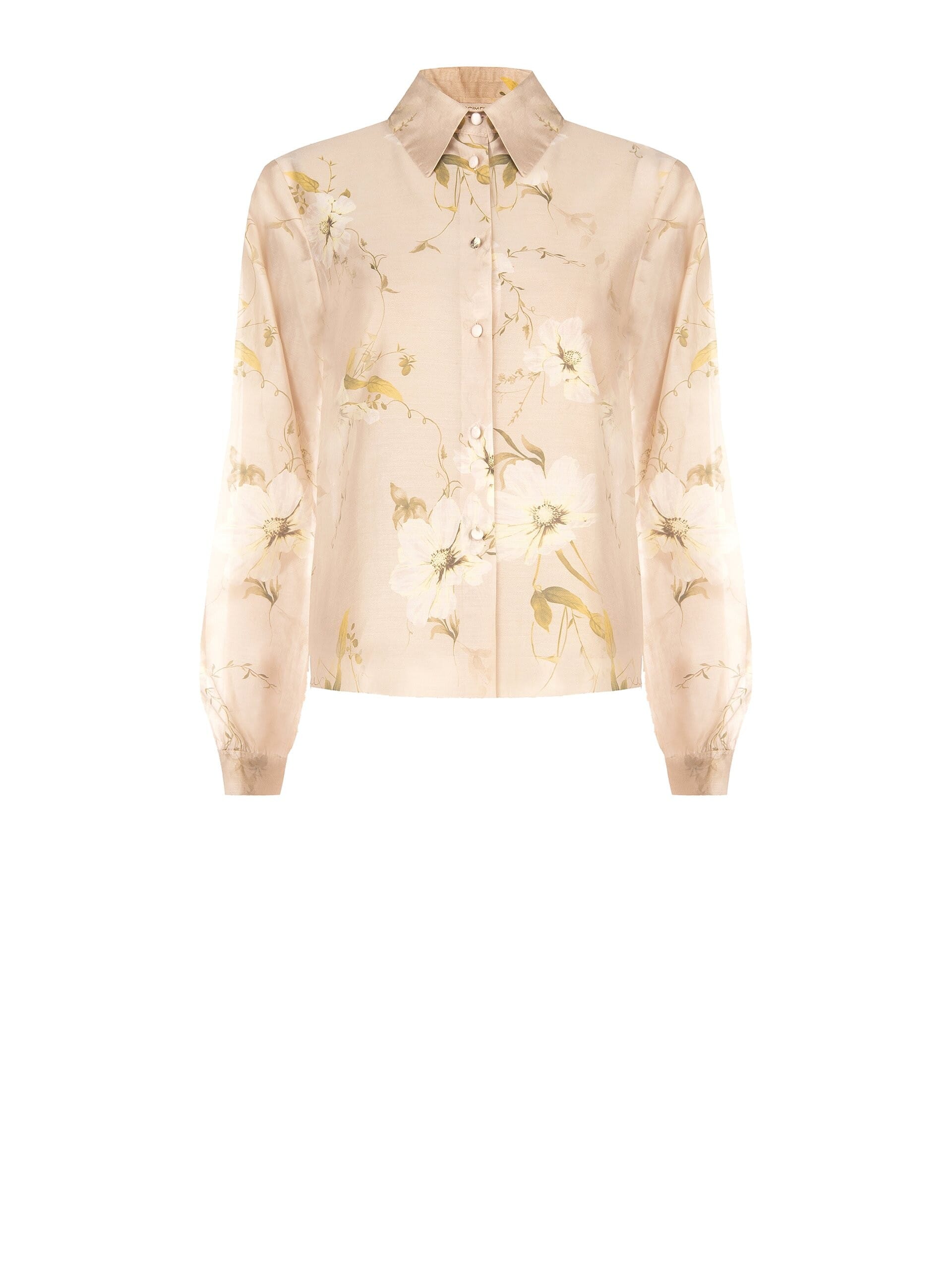Lightweight voile top with a straight line that skims the silhouette with discreet transparency. Structured collar, covered button fastening and long sleeves with cuffs. Perfect with tailoring trousers for the office or with denim and heels for an aperitif.