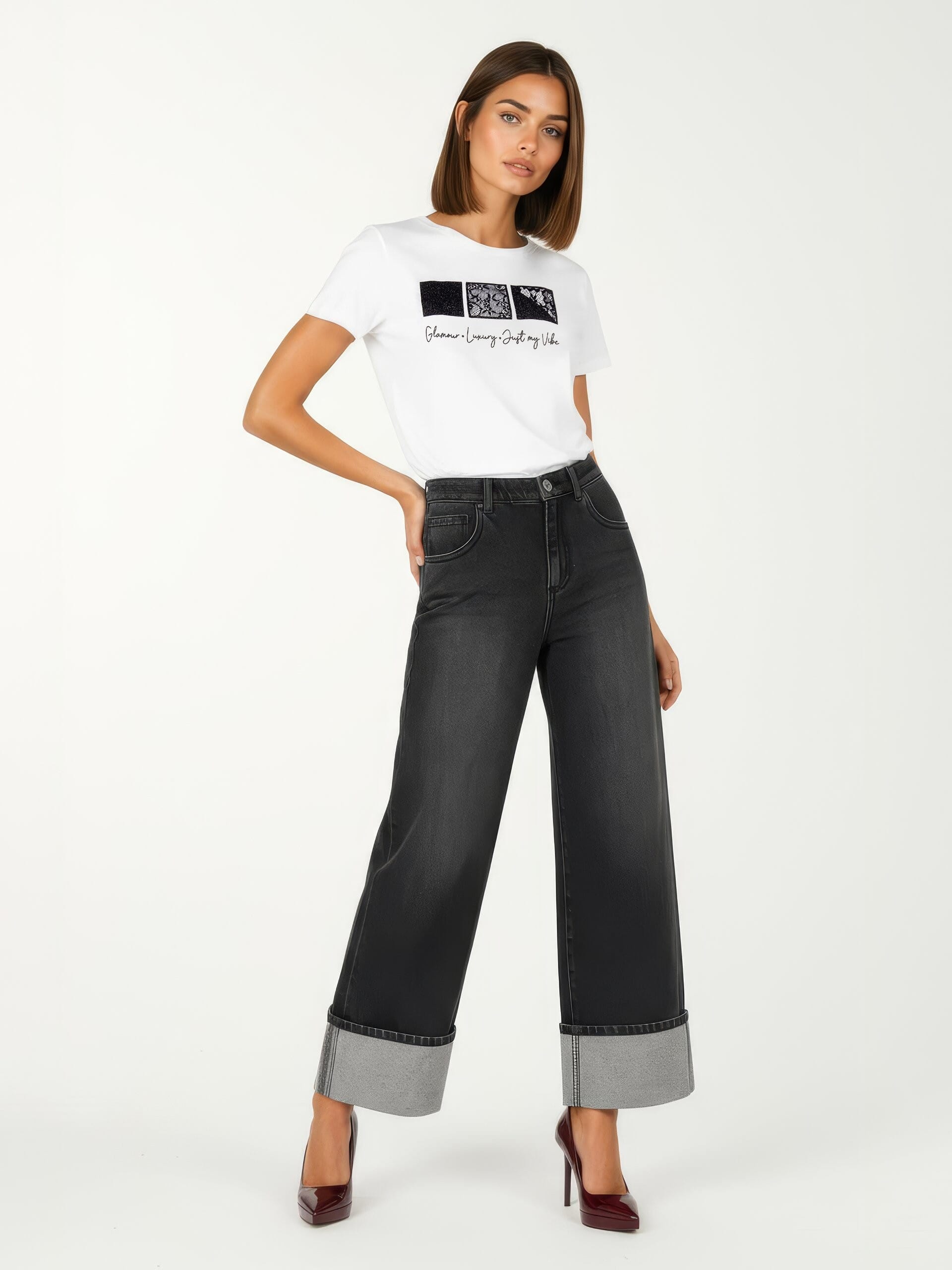 Slim-fit but comfortable T-shirt in soft jersey. The front is embellished with mixed applications of sequins and lace inserts, with graphic lettering that illuminates the silhouette. Clean round neckline, short sleeves. Perfect for everyday wear with denim, also ideal for aperitifs or casual parties.