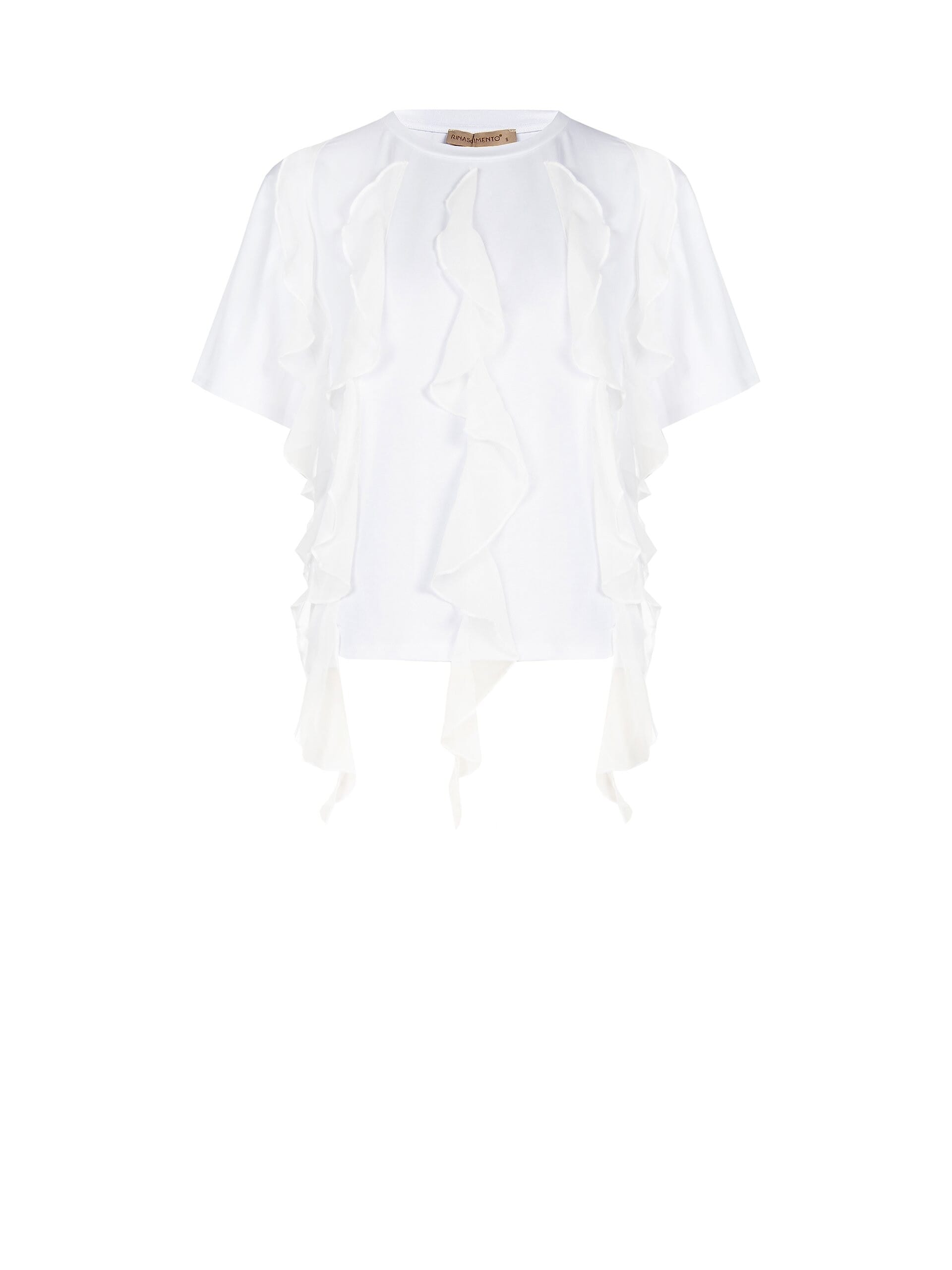 Soft jersey sweater with a straight fit, embellished with light georgette ruffle appliqués that descend on the front and sides, creating movement and slimming the figure. Clean crew neckline, length at the hip: perfect with jeans or tailoring trousers for everyday chic and aperitifs.