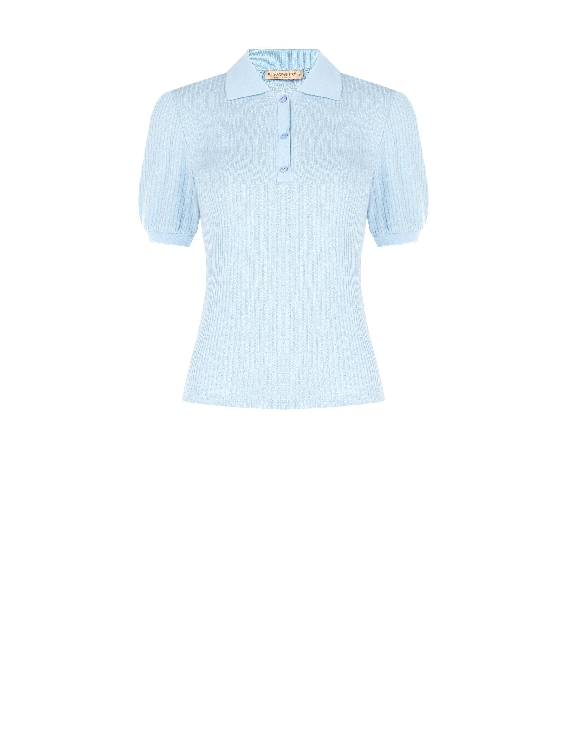 Short-sleeved jersey with a fitted fit that enhances the silhouette. In ribbed knit with a slightly shiny yarn, it has a buttoned polo collar and soft sleeves with an elasticated hem. Perfect with trousers and denim for the office and daily look.