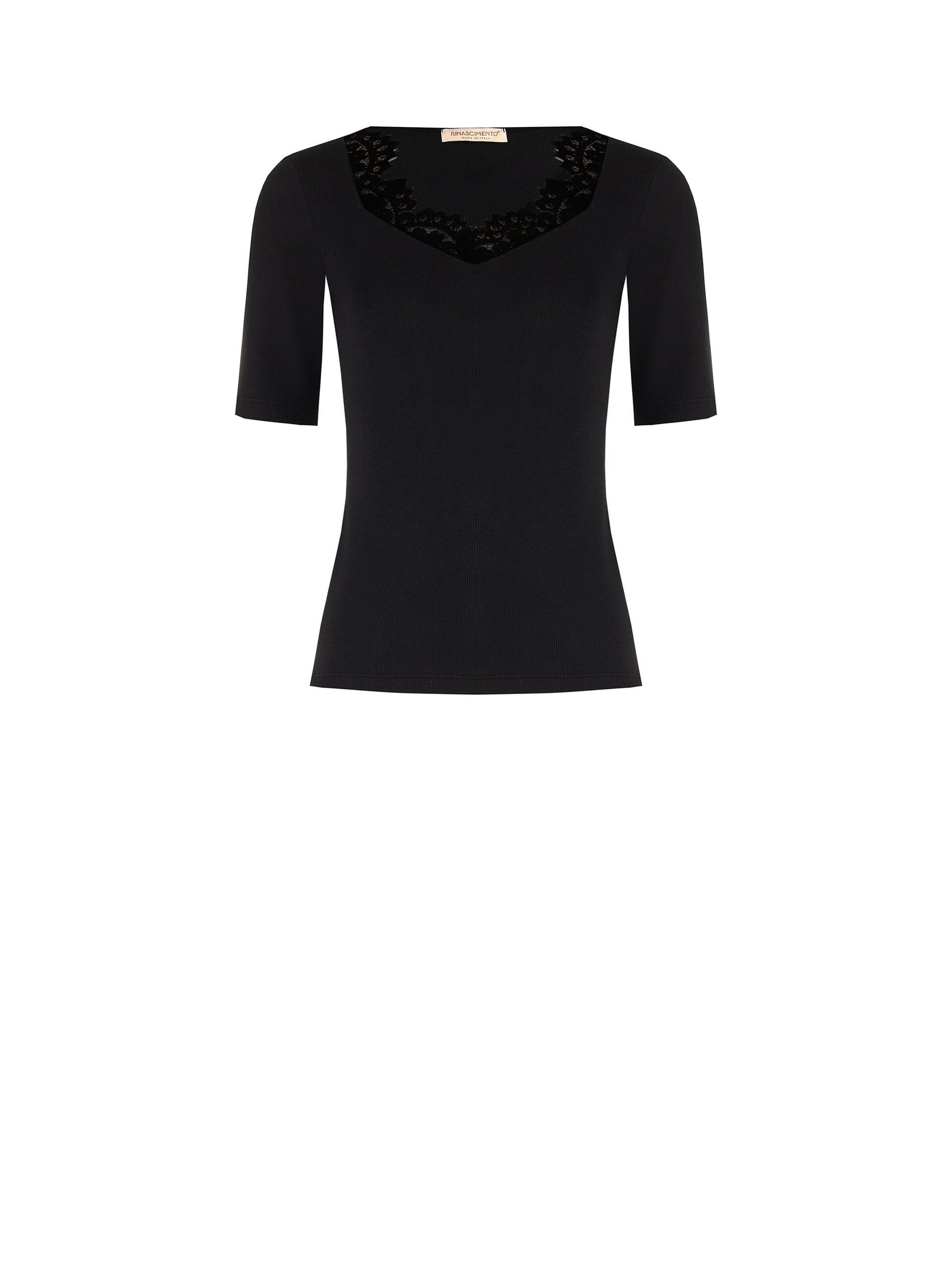 Fitted jersey in soft stretch knit that enhances the silhouette without constricting. V-neck framed by lace insert and elbow-length sleeves for discreet elegance. Perfect under a blazer in the office or on its own for an aperitif.