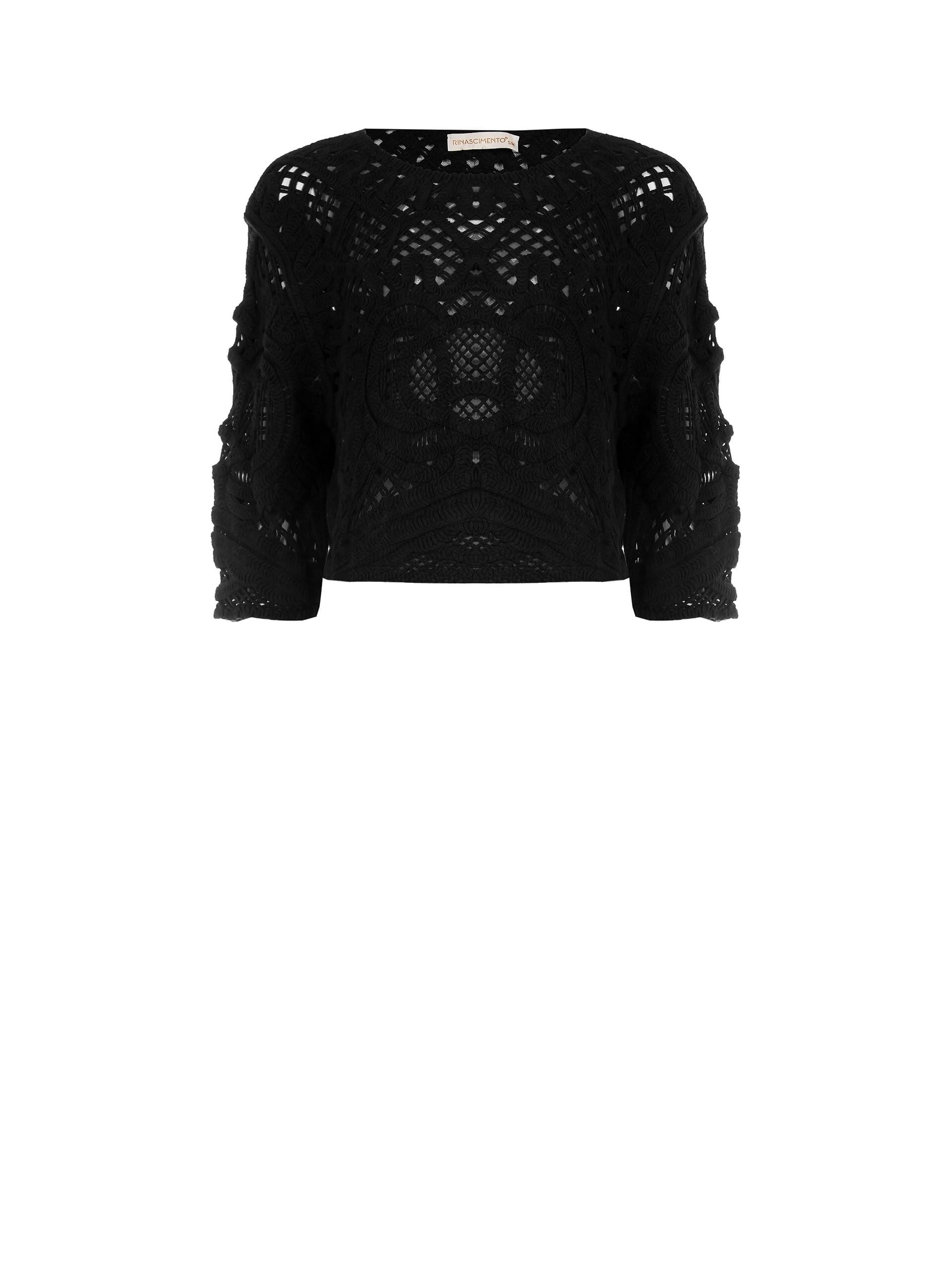 Soft-fitting short top in perforated crochet with three-dimensional workmanship that caresses the silhouette without marking it. Round neckline and 3/4 length sleeves enhance the décolleté. Perfect over an essential top for aperitifs, parties and summer evenings.