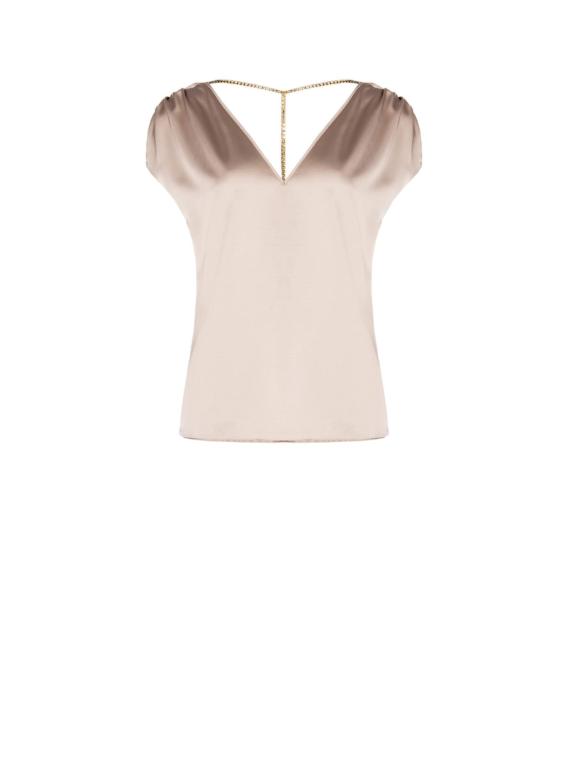 Fluid satin blouse with a soft line that glides over the body, with light gathered sleeves. V-neckline front and back, embellished with a jewelled chain with pearls on the back. Perfect with trousers or high-waisted skirts, from the office to an aperitif.