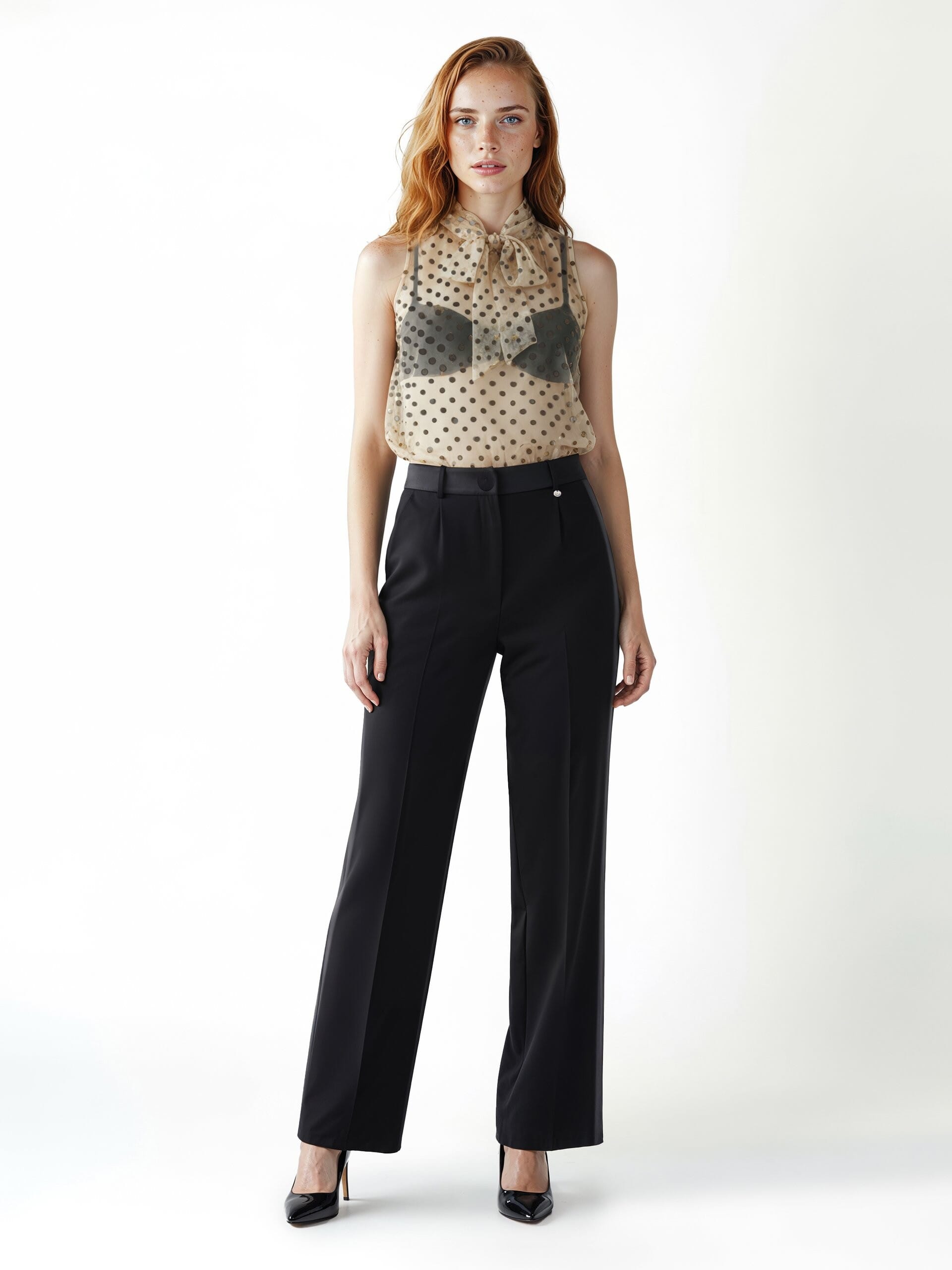 Sleeveless with a straight fit that caresses the silhouette. Light fabric with micro polka dot texture, pleasant on the skin and easy to layer. High collar with removable bow and back drop with buttons. Perfect with blazer in the office, irresistible with denim and heels for the aperitif.