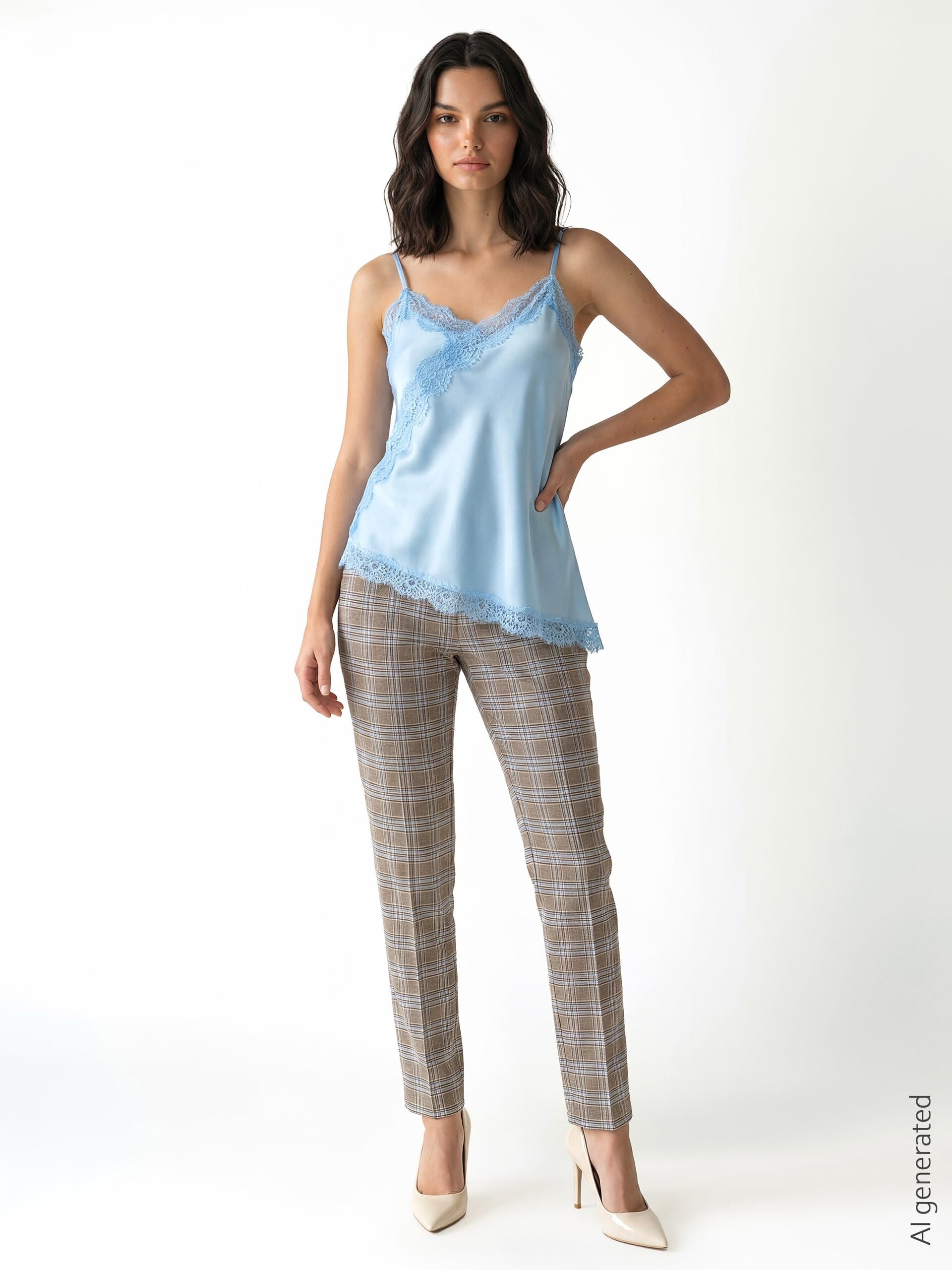 A soft, flowing line in a silk-effect fabric that caresses the body without marking it. The diagonal lace and asymmetric hemline enhance the silhouette, while the thin straps leave the shoulders uncovered. Perfect on its own for the evening or under a blazer for the office.