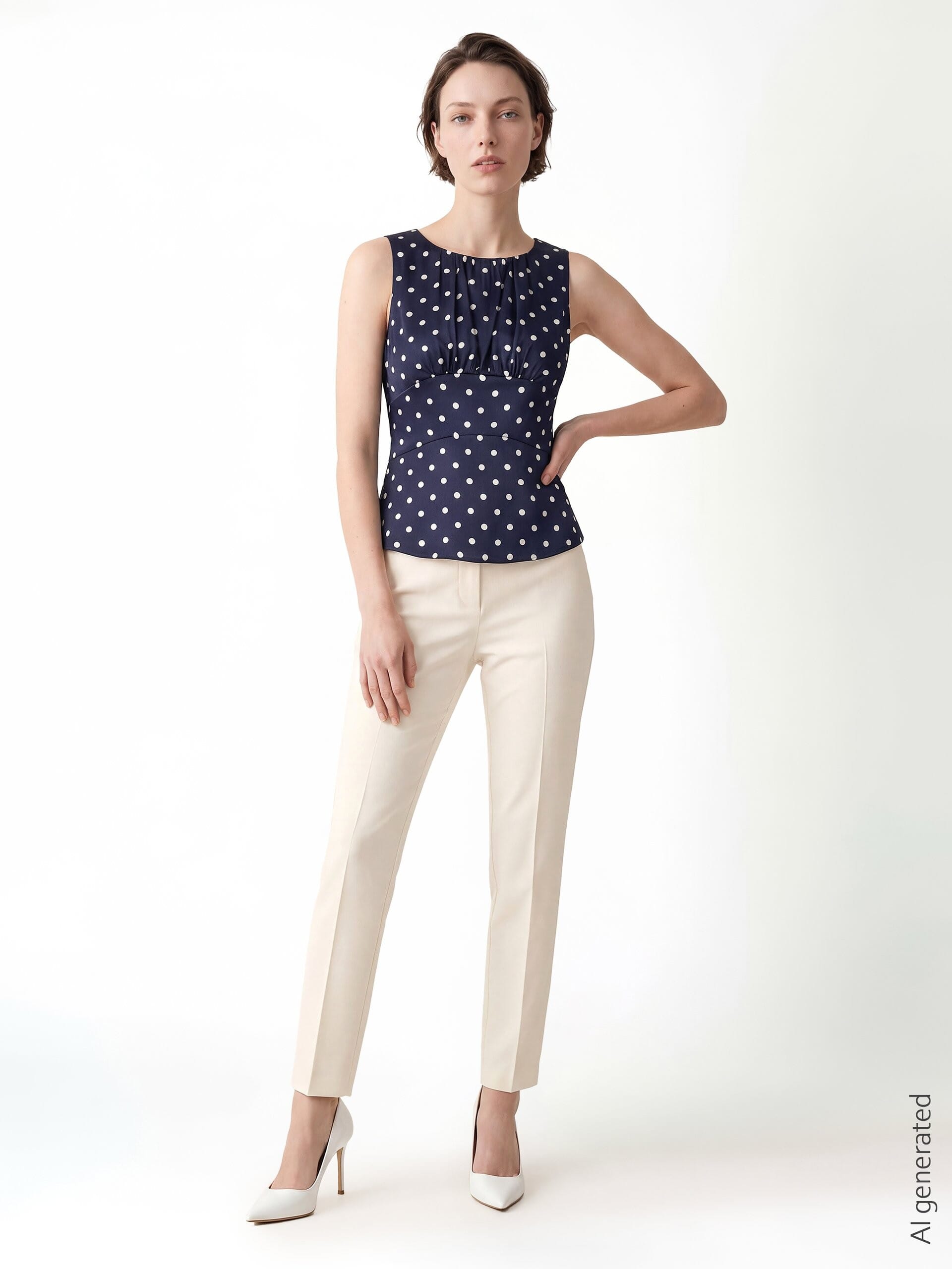Sleeveless blouse in a smooth, shiny fabric with a fitted waist and slight basque that enhances the silhouette. Round neckline with small gathers and drop opening at the back. Perfect with trousers or pencil skirt, from the office to an aperitif.