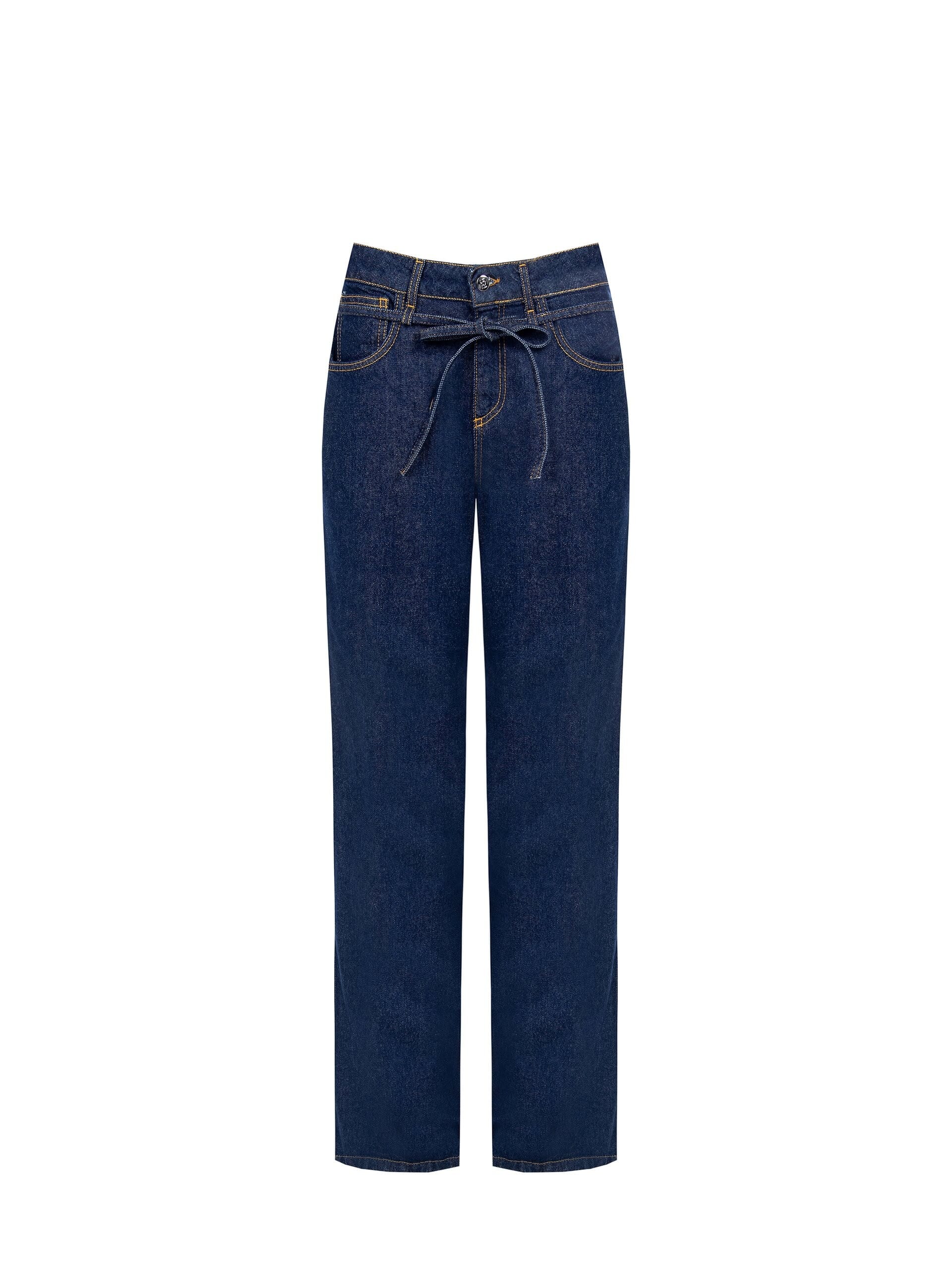 Straight-leg jeans in soft denim with light stretch, with a relaxed fit that slims the silhouette. The fabric belt to tie at the waist and exposed stitching add a chic touch. Perfect for everyday, from casual Friday to cocktail hour.