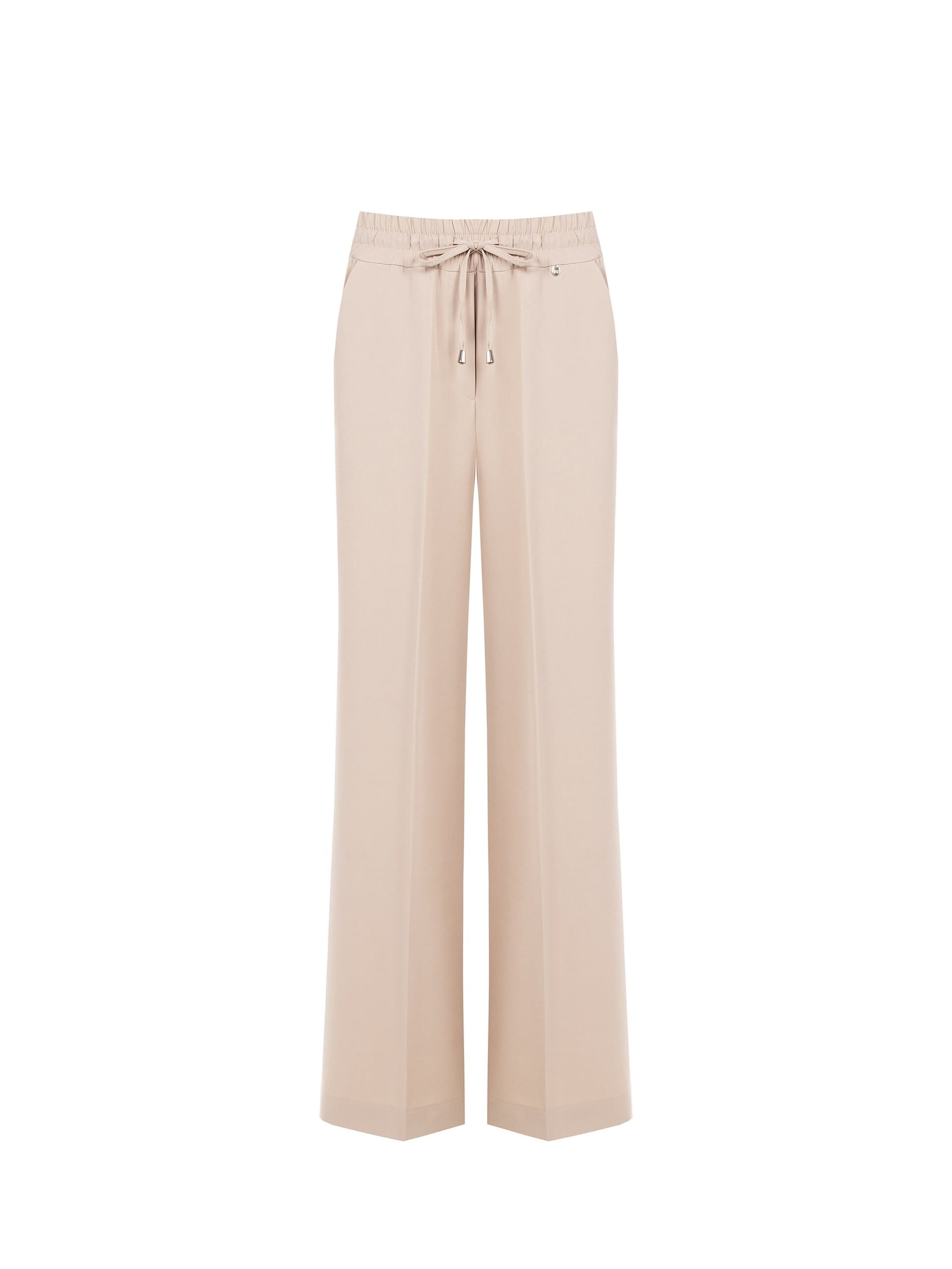 Wide, flowing line in soft, slightly slouchy fabric, which slims the figure without sacrificing comfort. Elasticated waist with drawstring and metallic details, discreet side pockets. Perfect from office to leisure, it fits with sandals, slingbacks or trainers.