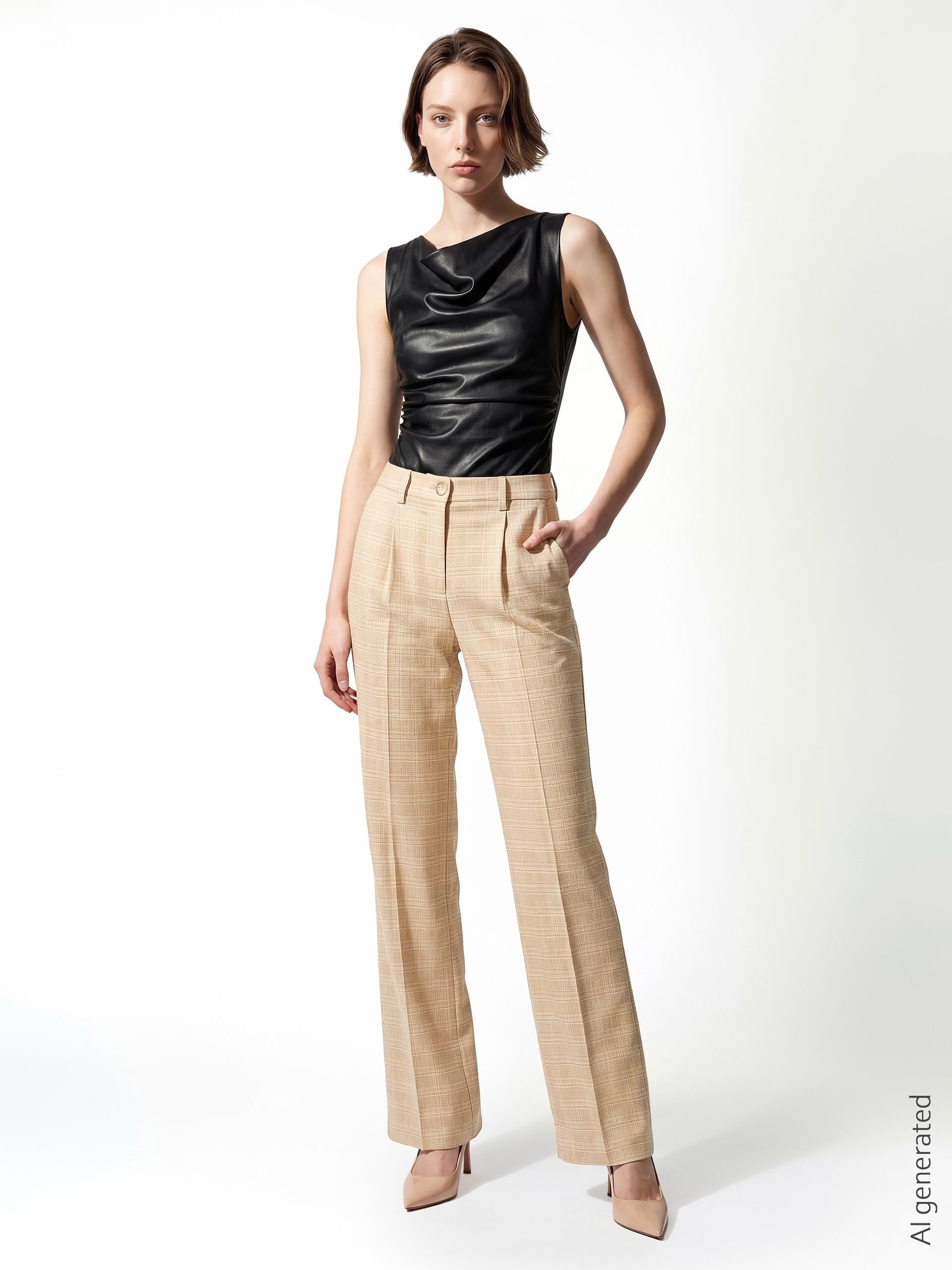 Straight-leg tailored model in lightweight micro-patterned pinstripe fabric with front pleat and French pockets. The button fastening and belt loops at the waist enhance the silhouette. Perfect from office to cocktail, with matching blazer or flowing top.